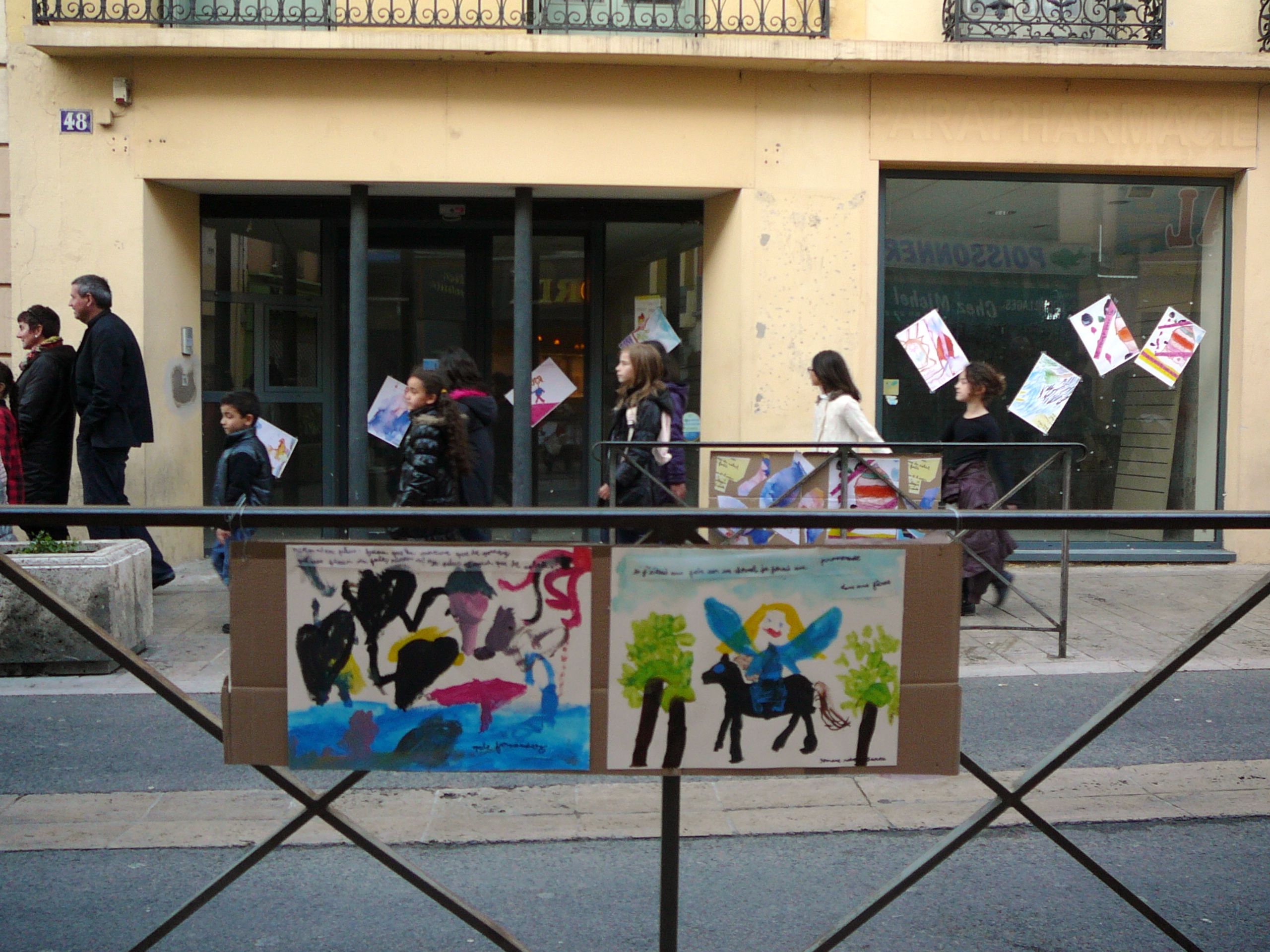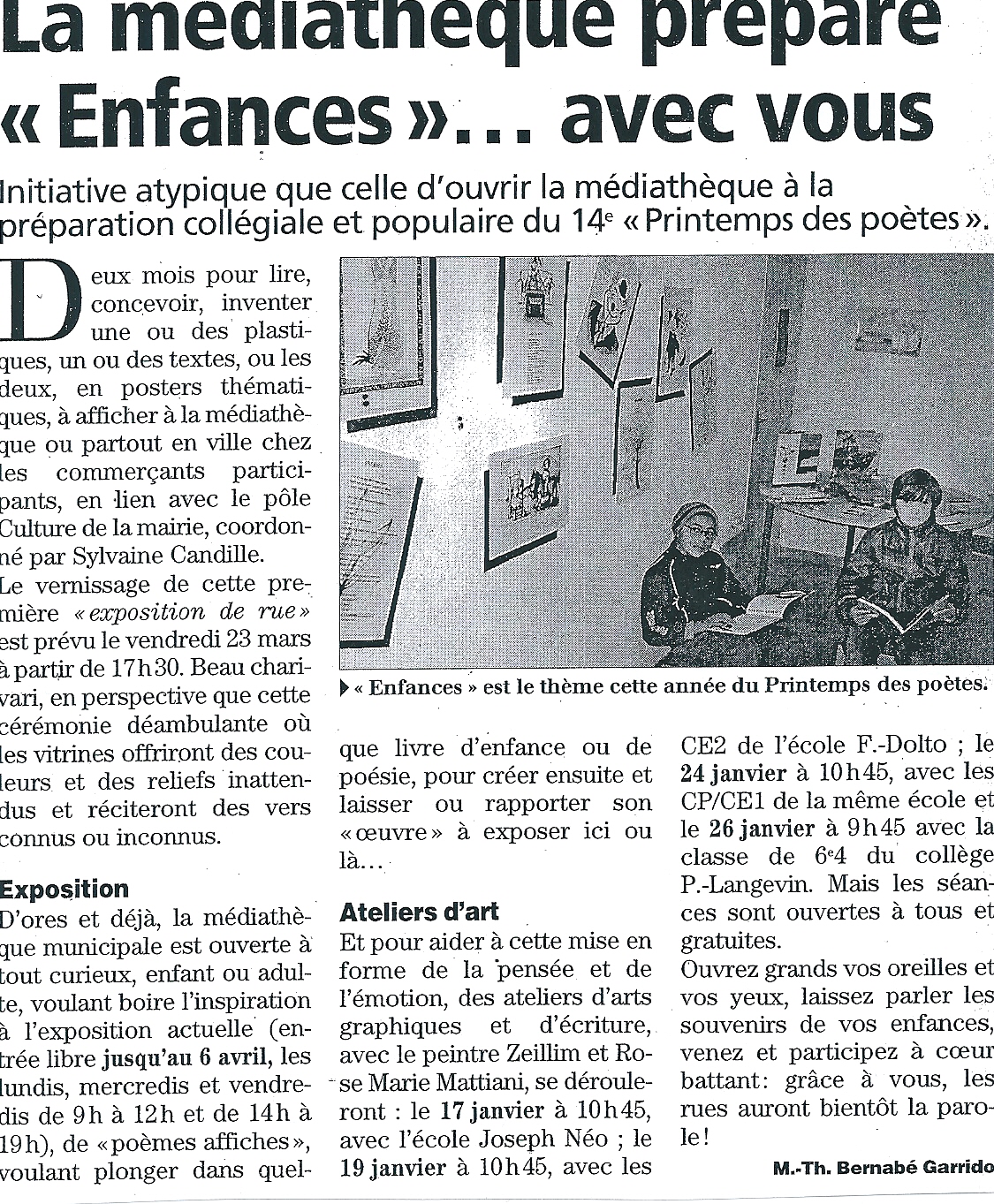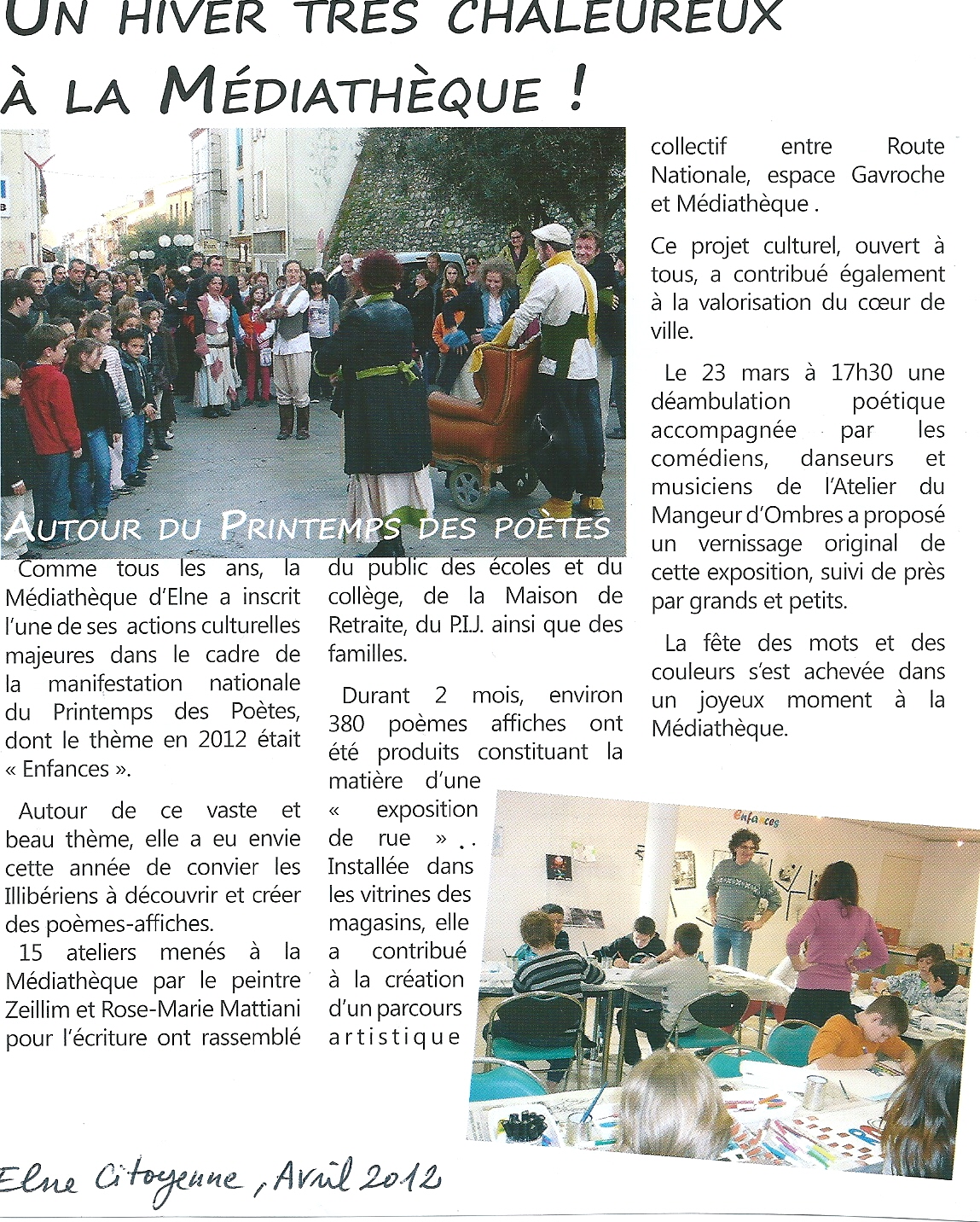 Dans le cadre du Printemps des Poètes 2012, au sein de la Médiathèque Pierre Capeille d’Elne, j’ai animé des ateliers de création de poèmes-affiches sur le thème « Enfances » de janvier à mars avec des classes d’enfants du CP à la 6ème, des anciens de la Maison de retraite d’Elne, des adolescents du PIJ, des familles…