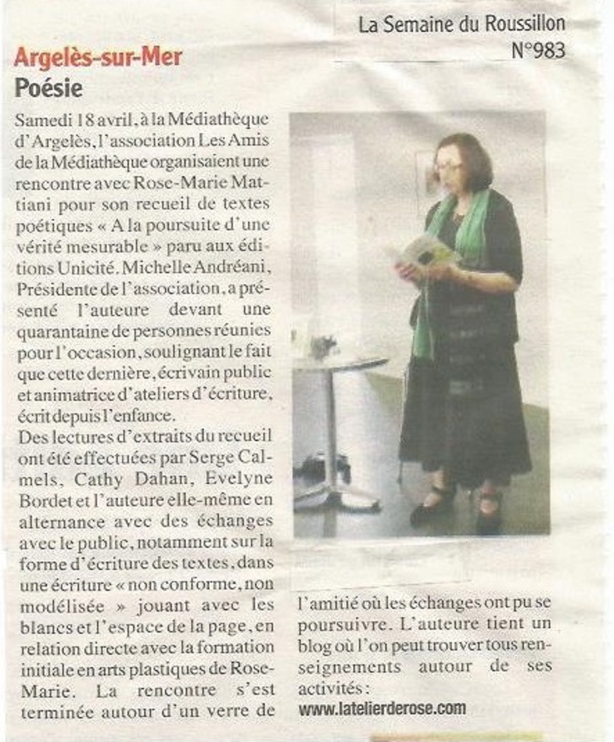 Lectures de « A la poursuite d’une vérité mesurable » à la Médiathèque d’Argelès-sur-Mer. Semaine du Roussillon, avril 2015.