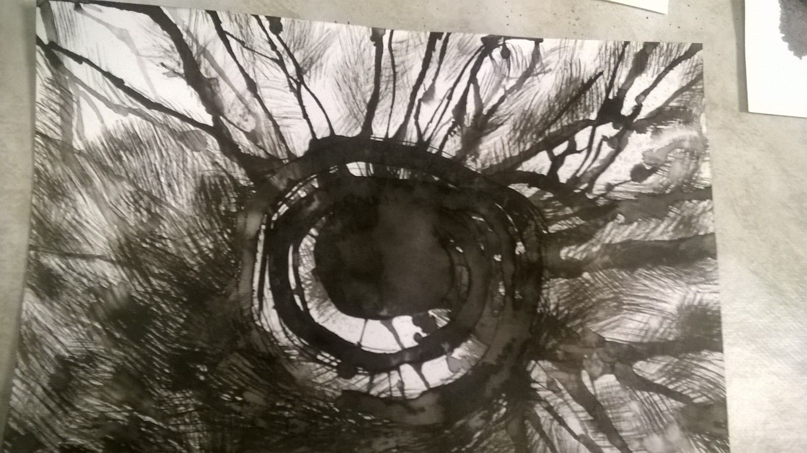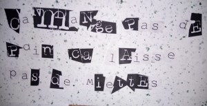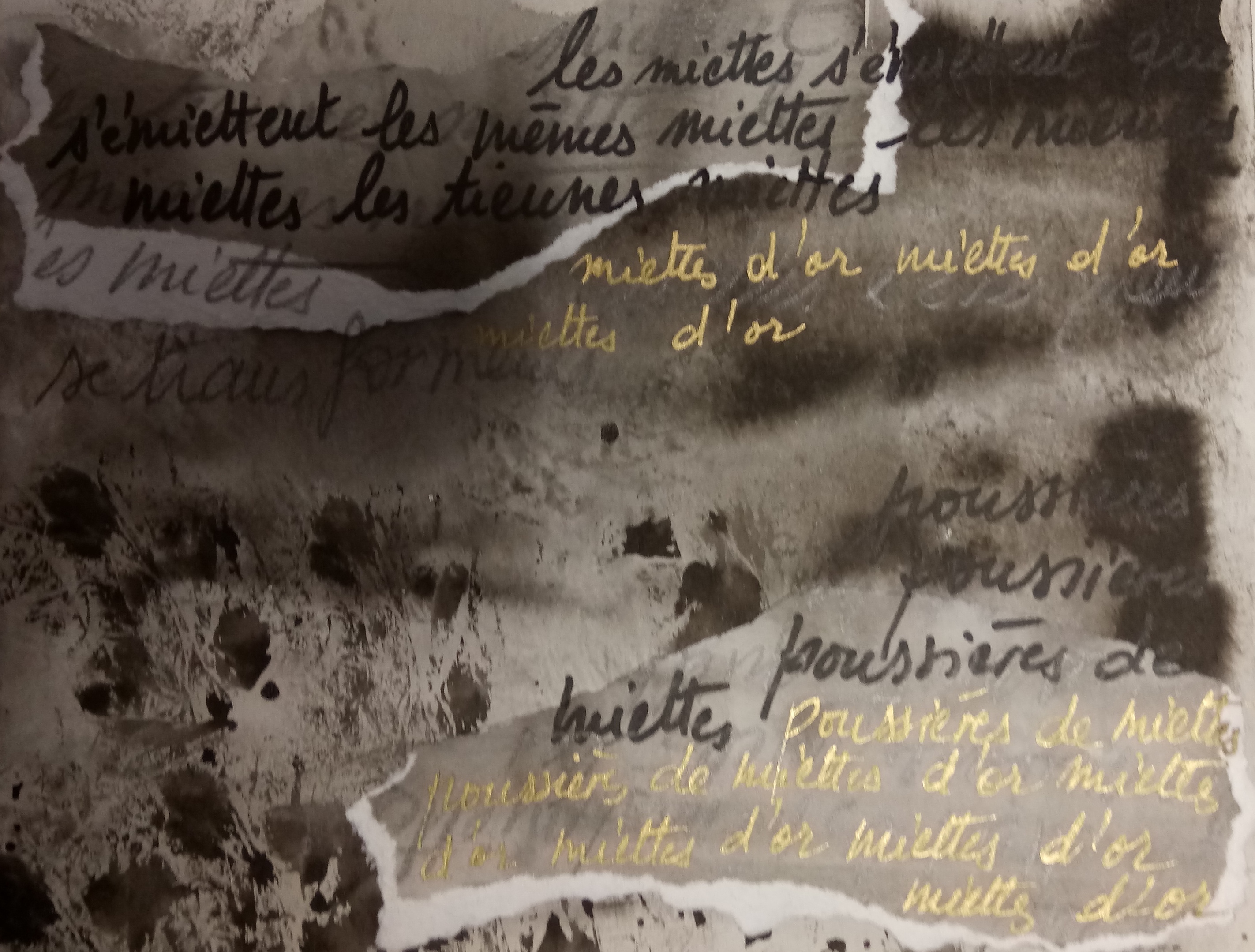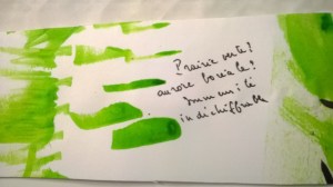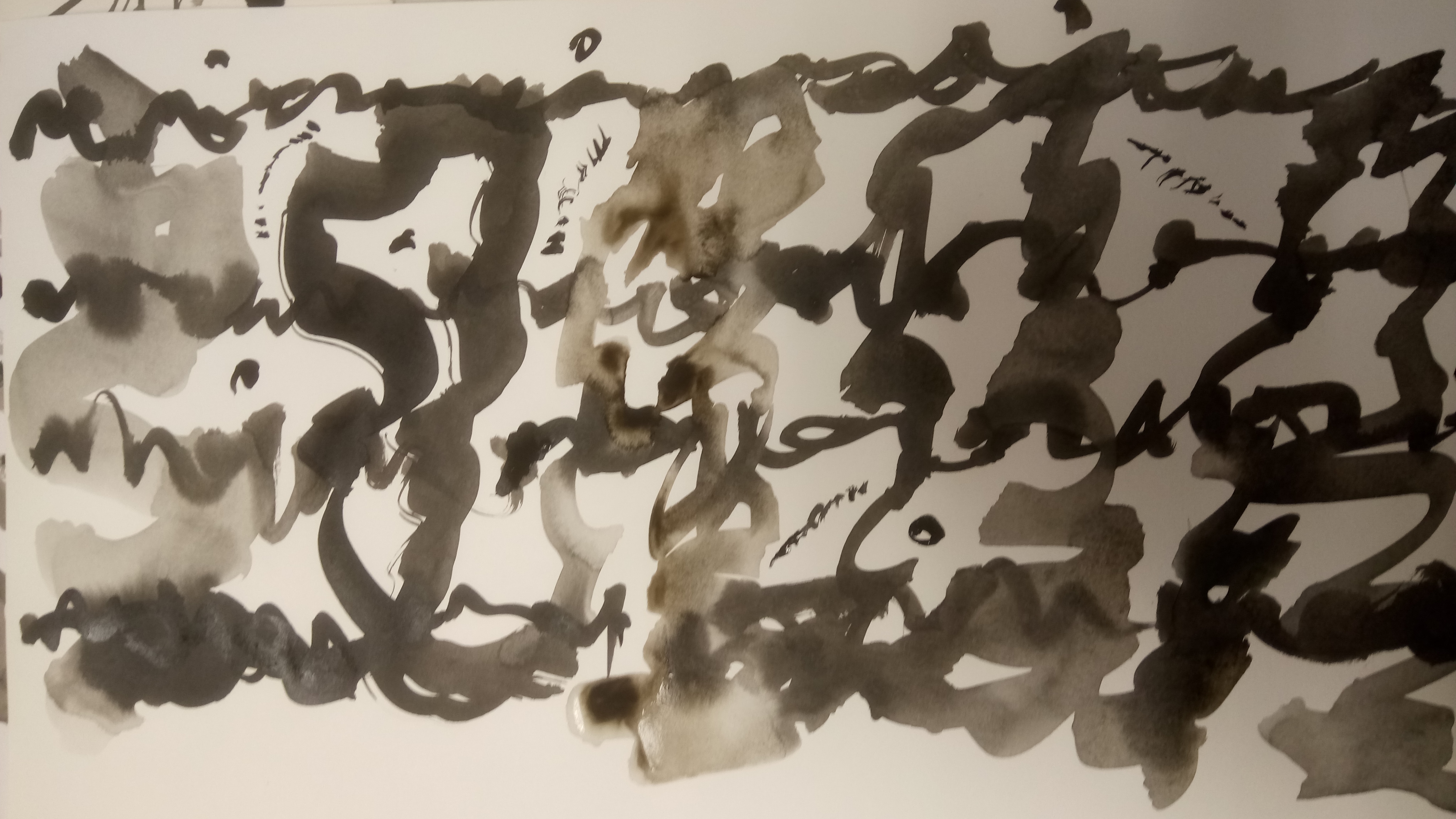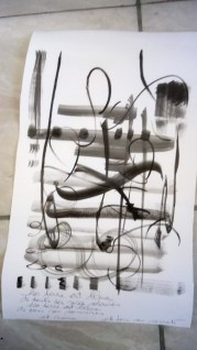 Un atelier où sont mis à disposition feuilles à dessin, vaporisateur d’eau, encre de chine, pinceaux, chiffons… Chacun est invité à s’exprimer librement avec encre et papier. Les feuilles tournent ; on écrit sur son propre support, on écrit d’après les œuvres des autres… mots, phrases, textes s’enchaînent…