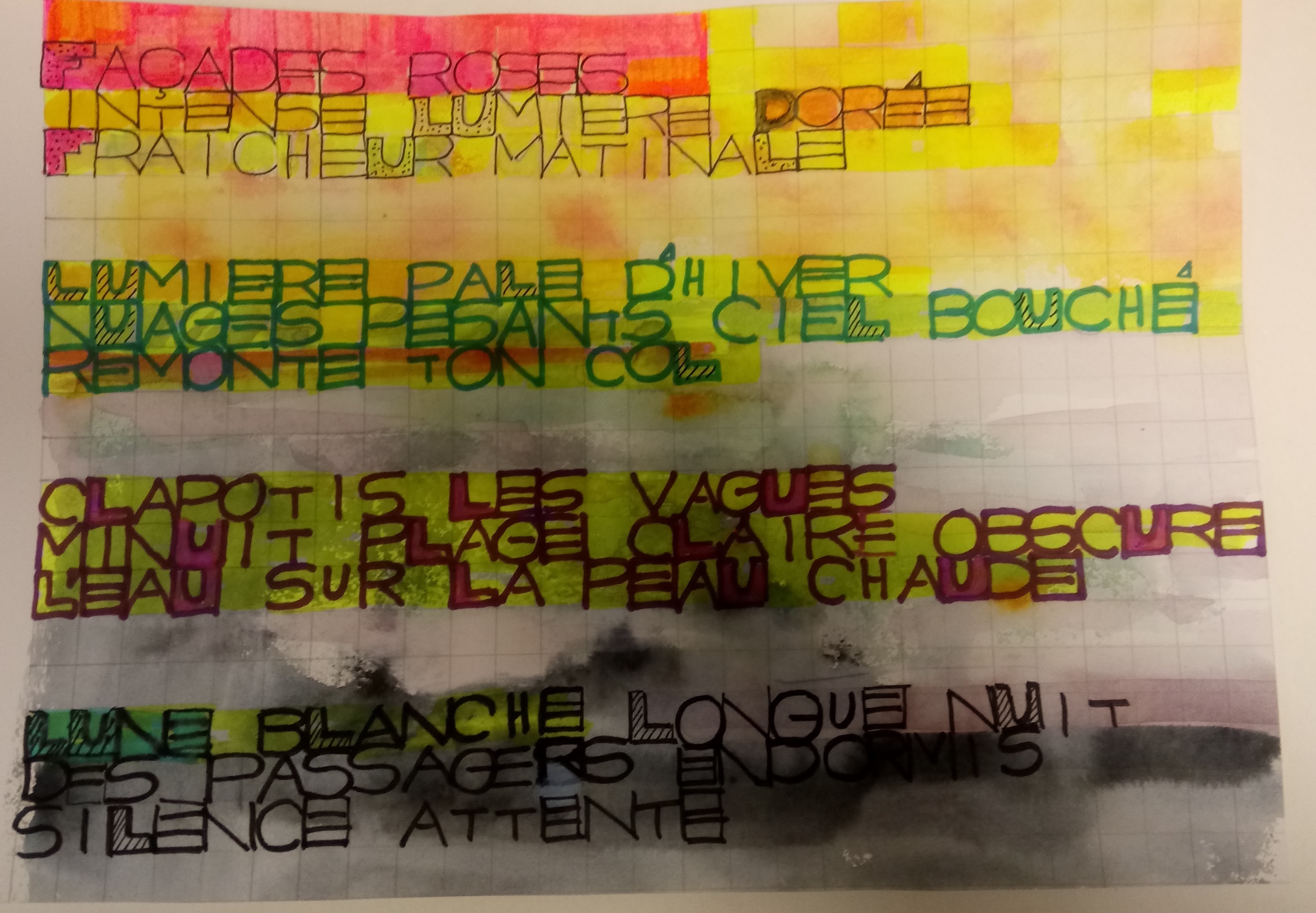 « Façades roses / intense lumière dorée / fraicheur matinale » – « Lumières pâles d’hiver / Nuages pesants ciel bouché / remonte ton col » – « Clapotis sur les vagues / minuit plage obscure / l’eau sur la peau chaude » – « Lune blanche longue nuit des passagers endormis / silence attente » de Annie P.
