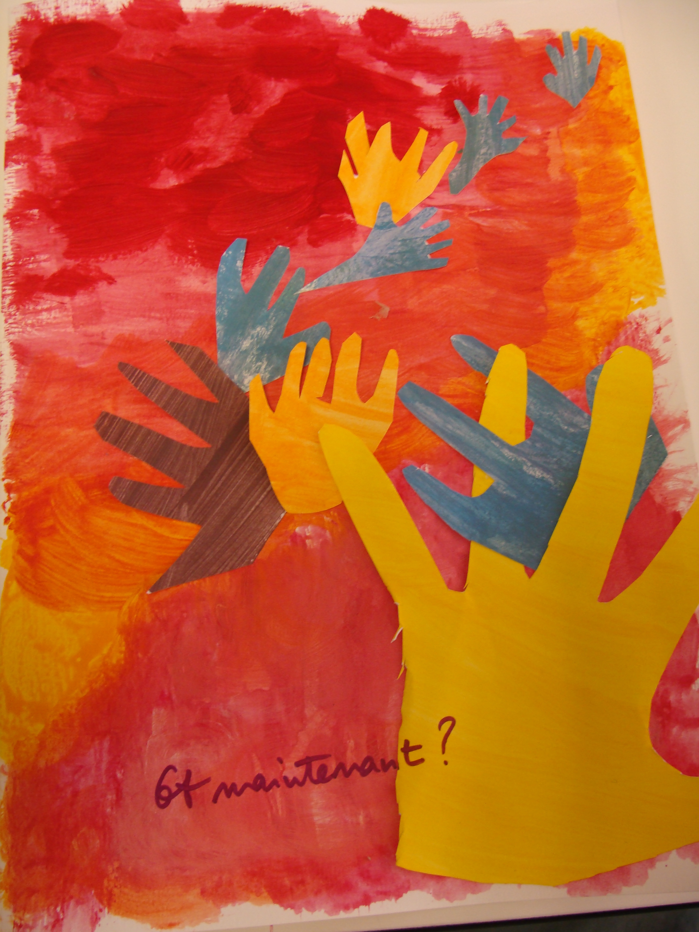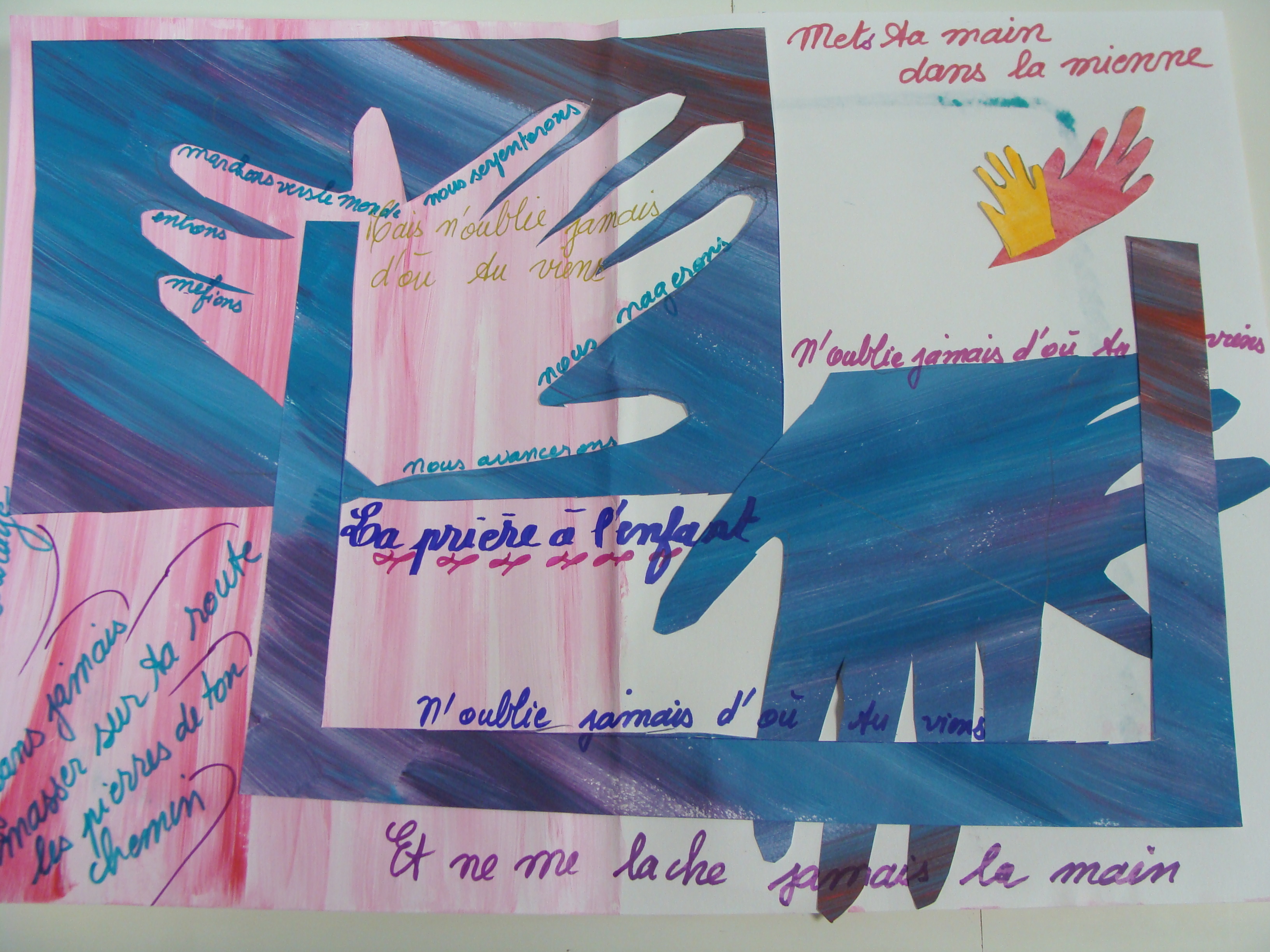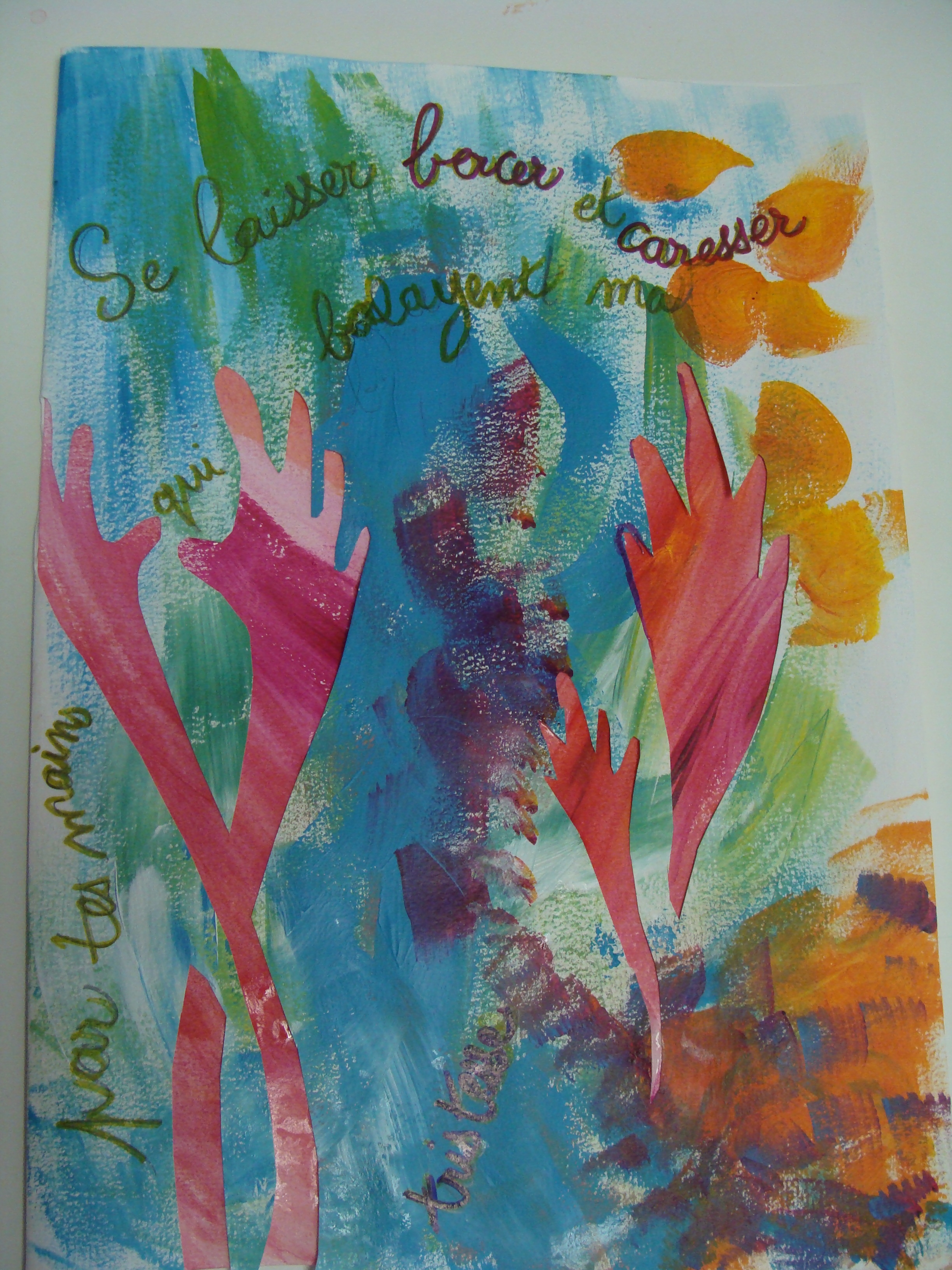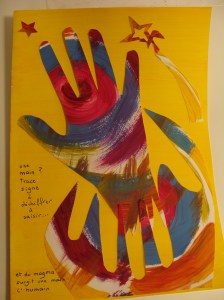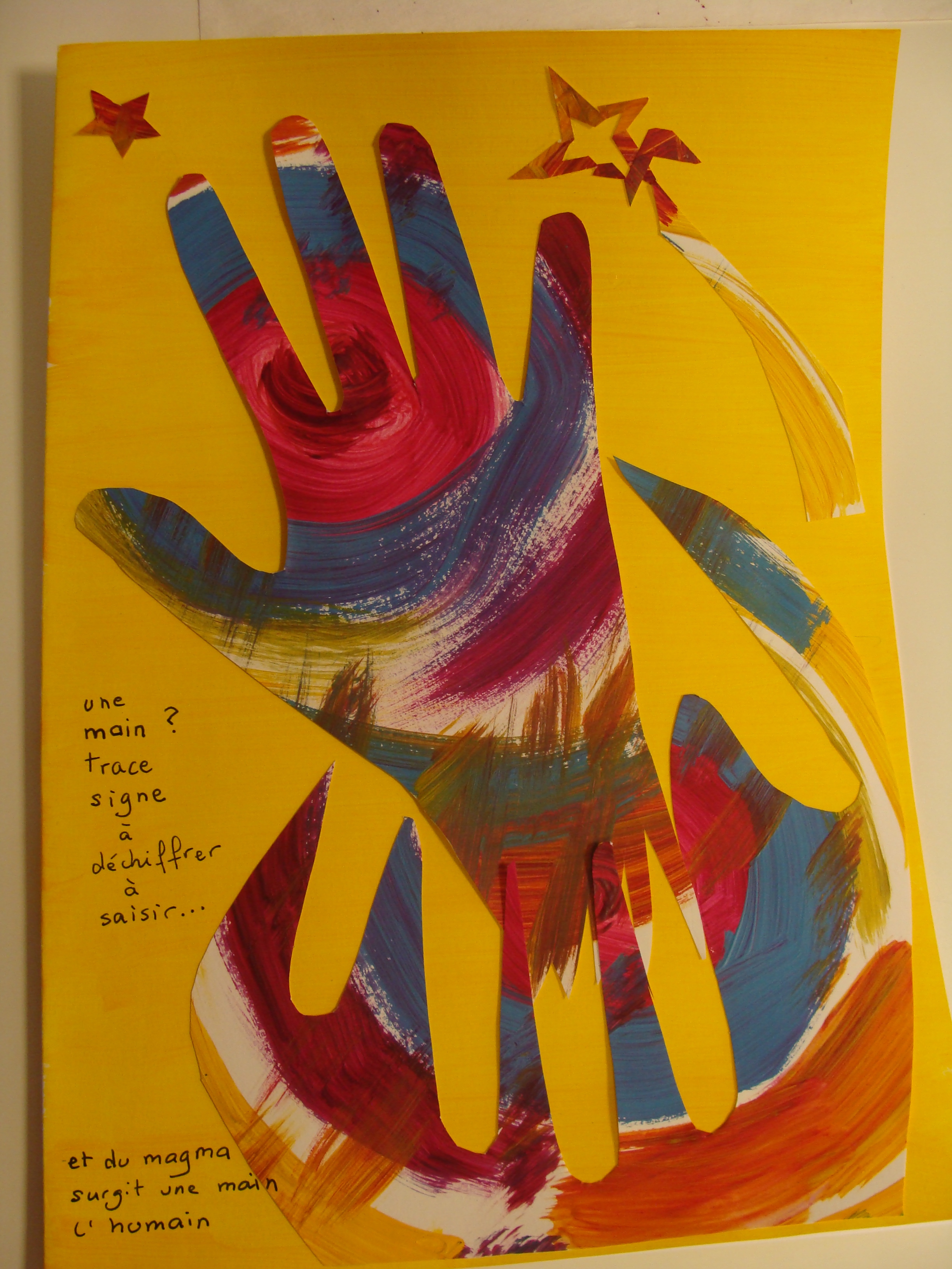 Atelier du 17.06.2017 : Les mains. Textes-supports pour l’écriture : « Les mains d’Elsa » Louis Aragon, 1963 / « Les 5 doigts de la main » Louis Bertrand, 1842 / « Le monde dans mes mains » Pierre Gamarra / « La main et l’intelligence » In Aristote, Des parties des animaux. Puis séance d’arts plastiques d’après les papiers découpés d’Henri Matisse :