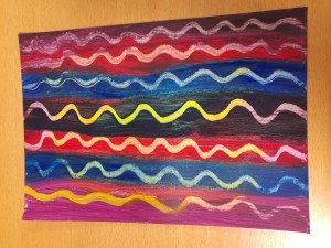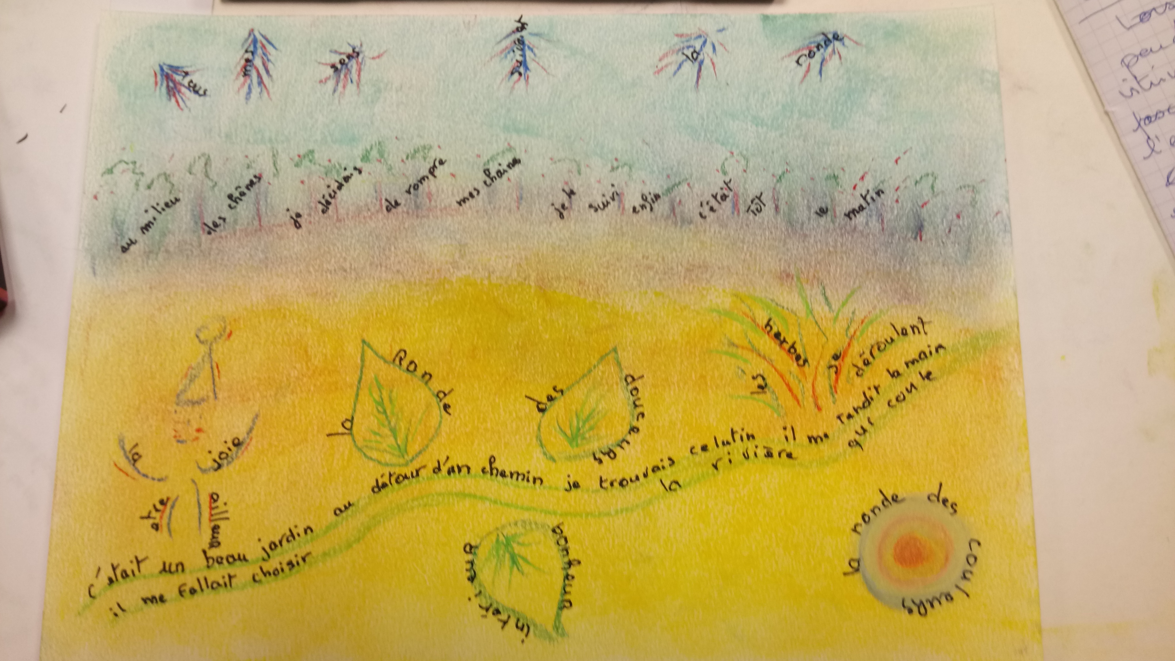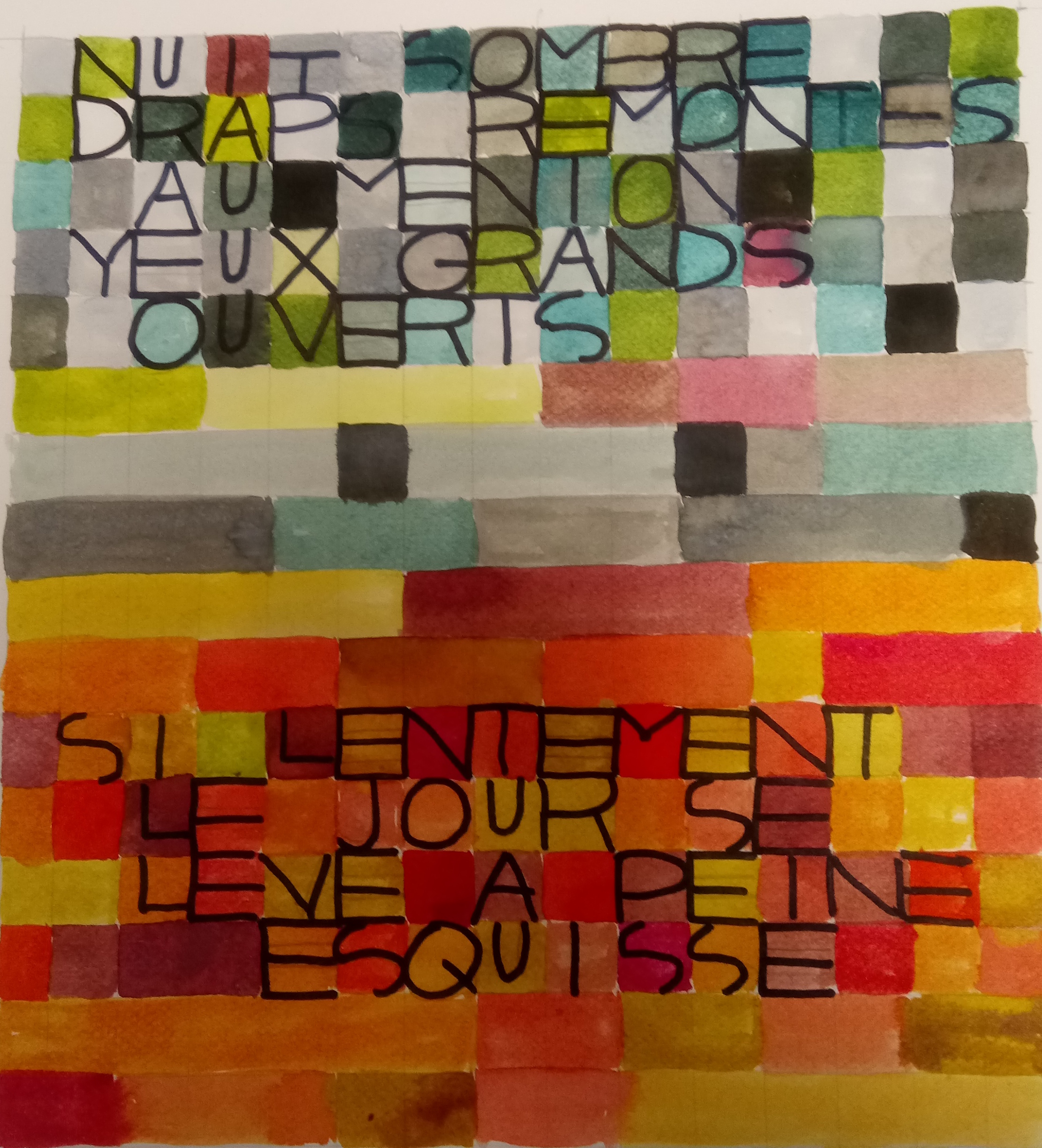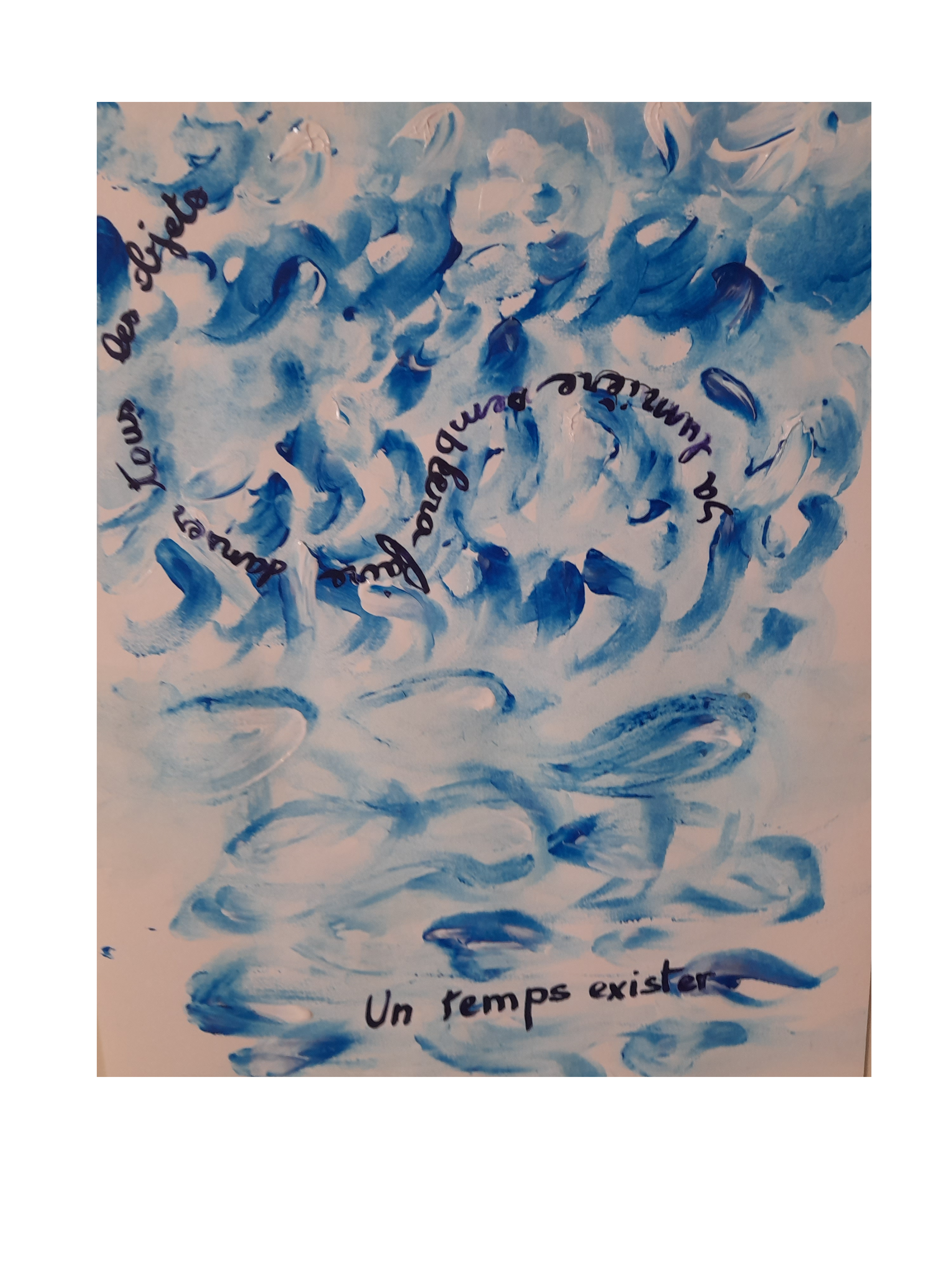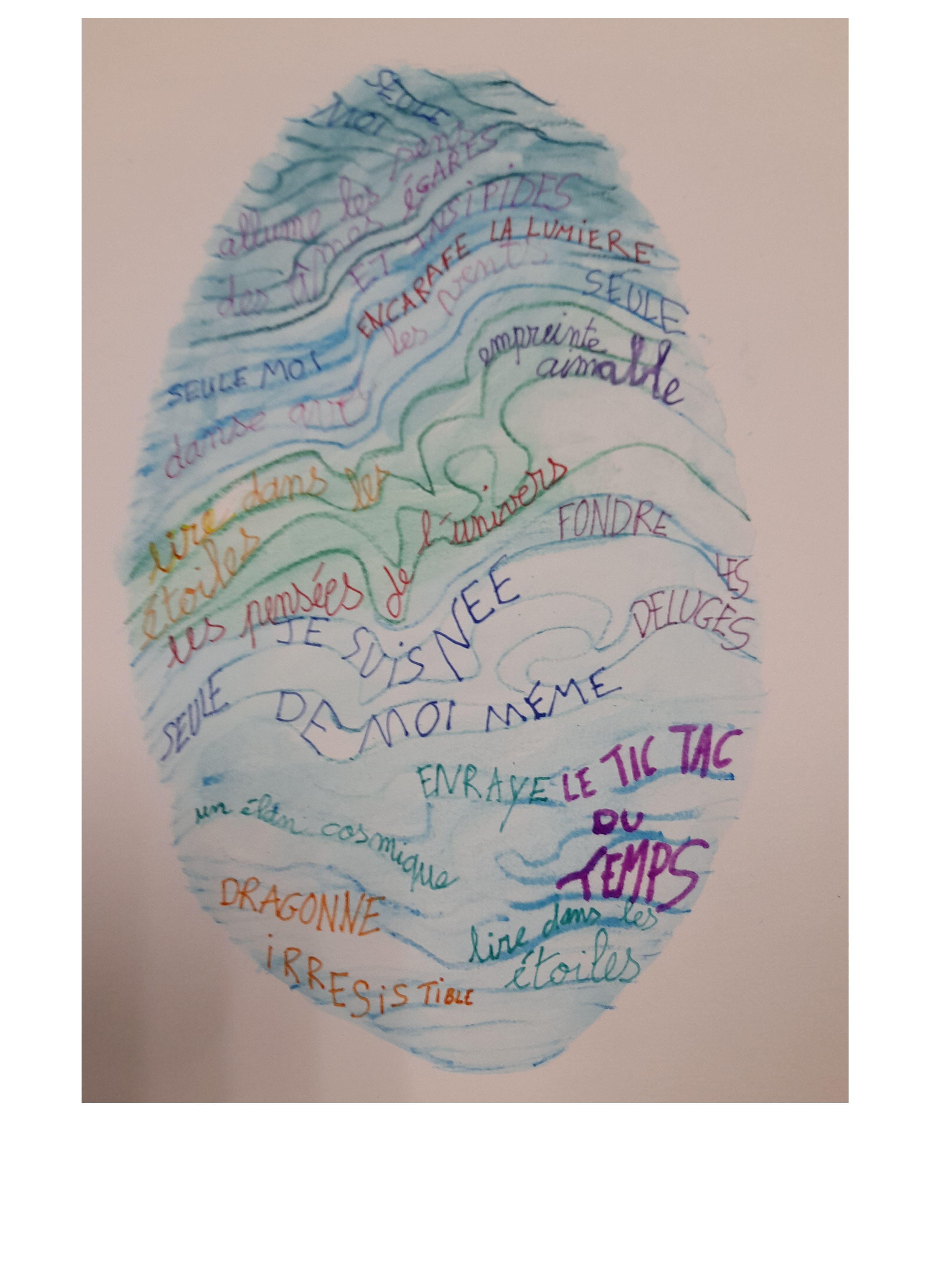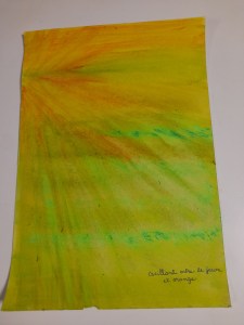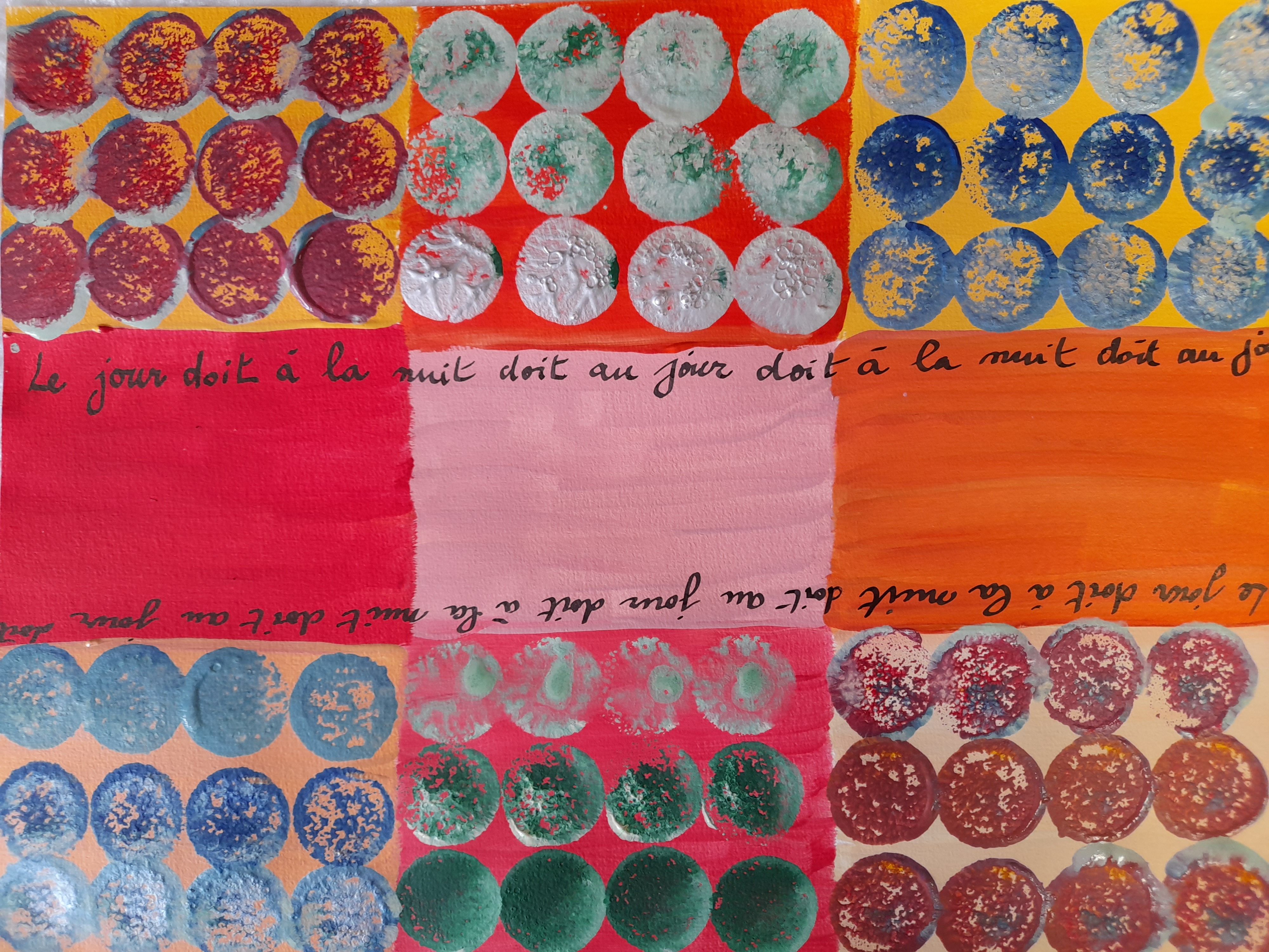 Atelier du 30.09.2017 : Haïkus sur le thème « jour et nuit » puis découverte de l’aquarelle « Jadis surgi du gris de la nuit » de Paul Klee, qui fait partie d’un ensemble d’œuvres dites « calligrammiques » où texte et image ne font qu’un. Le thème « jour et nuit » nous a permis de travailler également les tons chauds et froids…