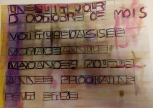« Une nuit jour d’octobre ce mois / voiture cassée / voyage annulé / vacances foutues / année prochaine peut-être » Huguette C.