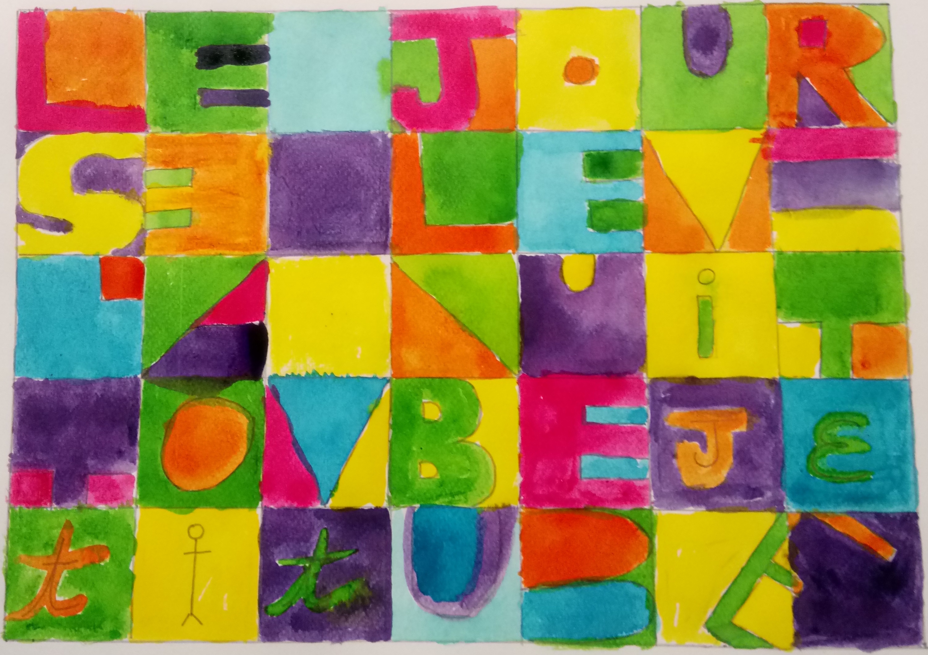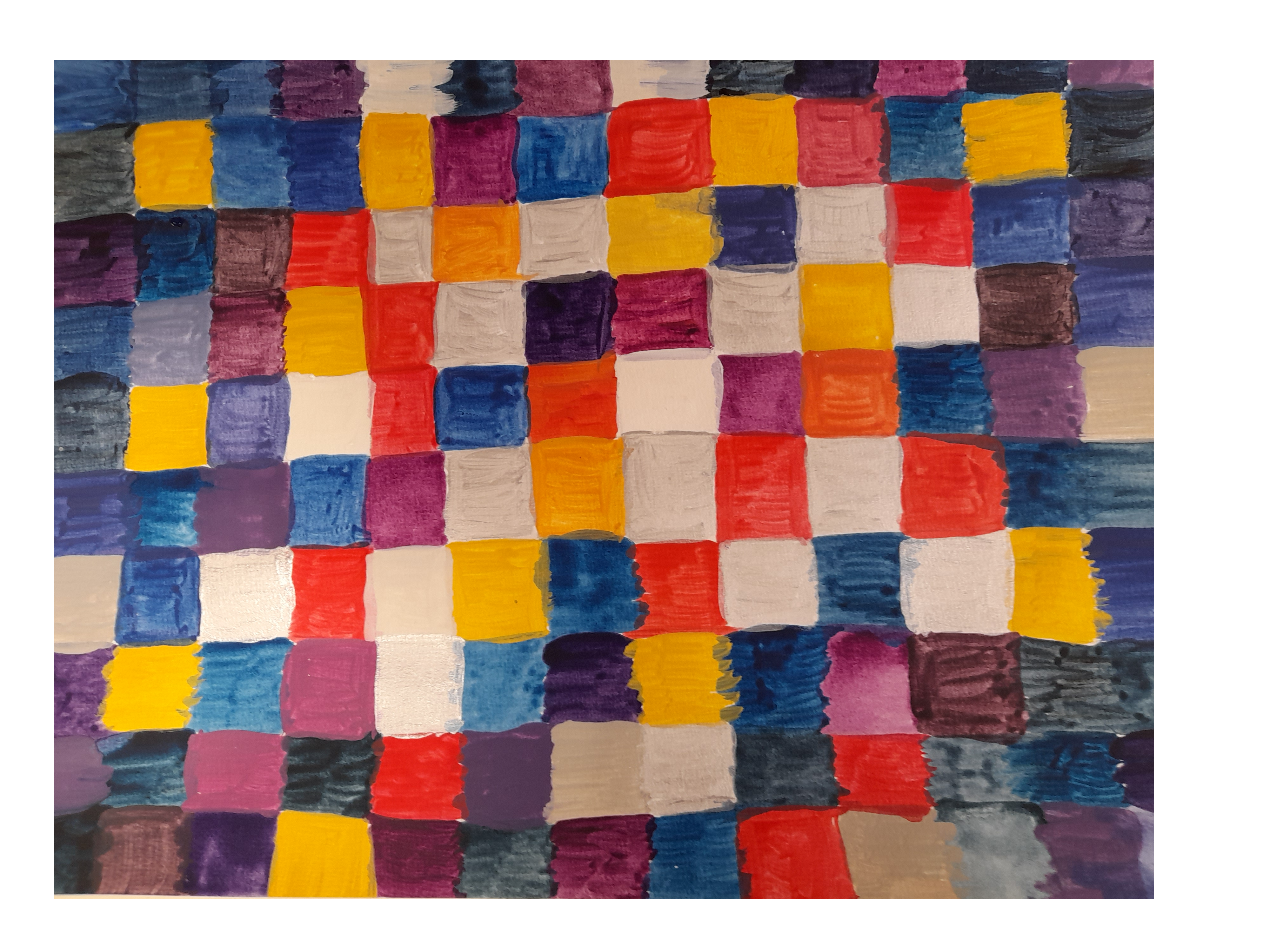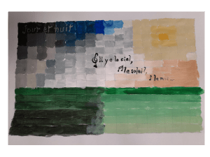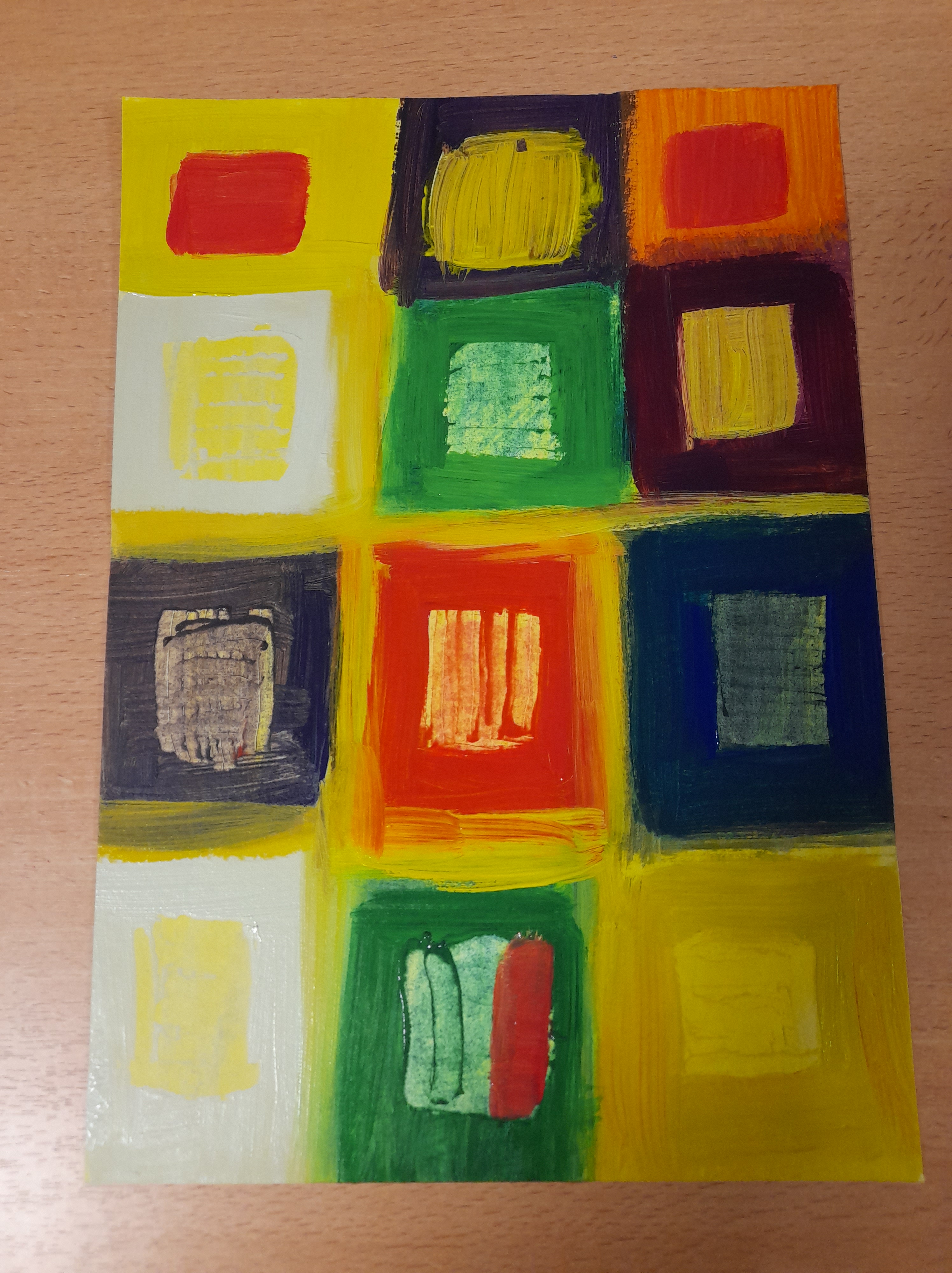 D’après les « Carrés magiques » de Paul Klee. Carrés magiques, obscurité, jour… On a joué à la fois sur l’obscur et la lumière au travers de formes géométriques, entre abstrait et figuratif. On a réalisé des carrés magiques avec des traits tracés à main levée. Et joué avec des couleurs pour définir les zones d’obscurité : couleurs froides / zones de lumière : tons chauds.