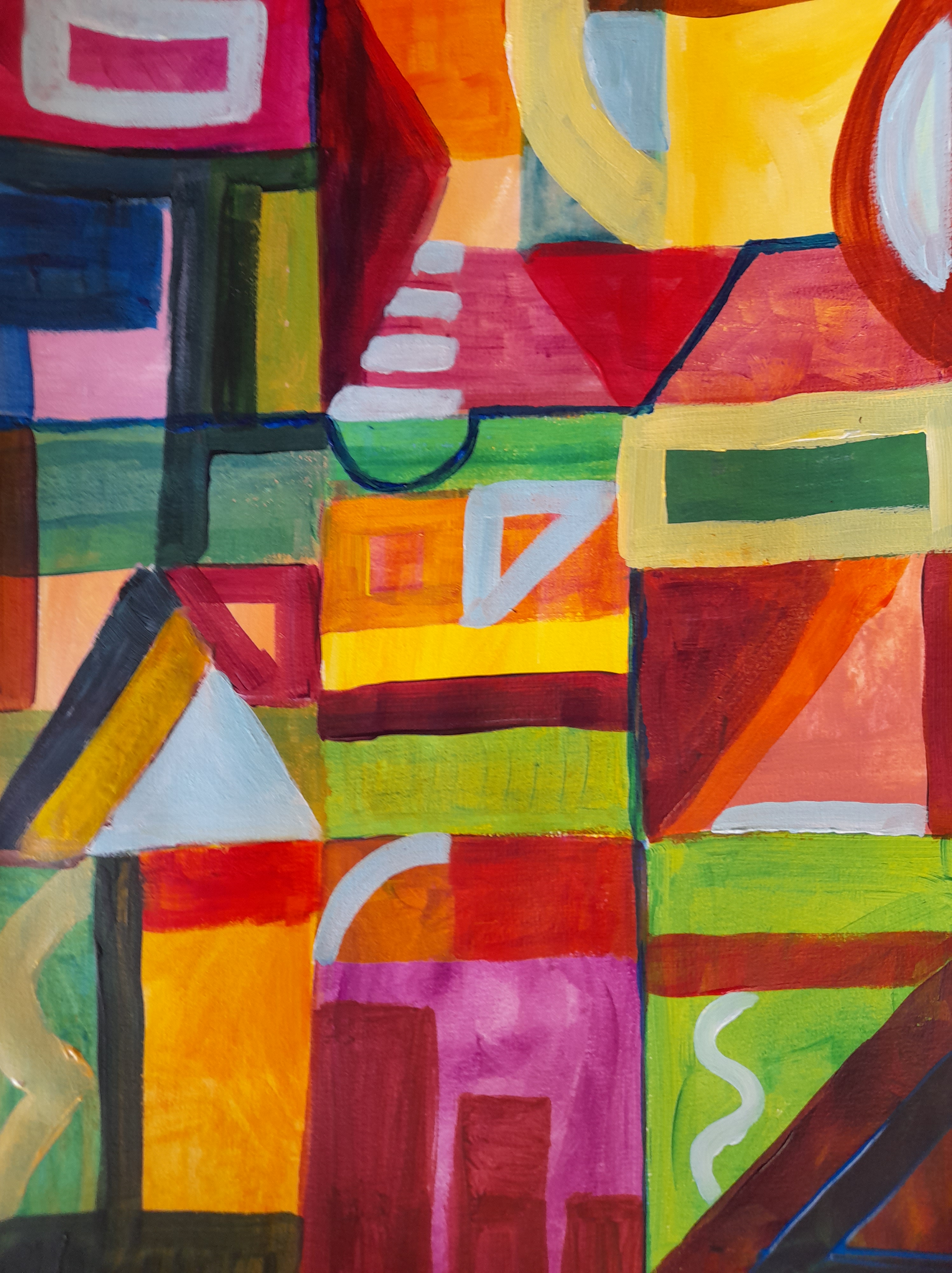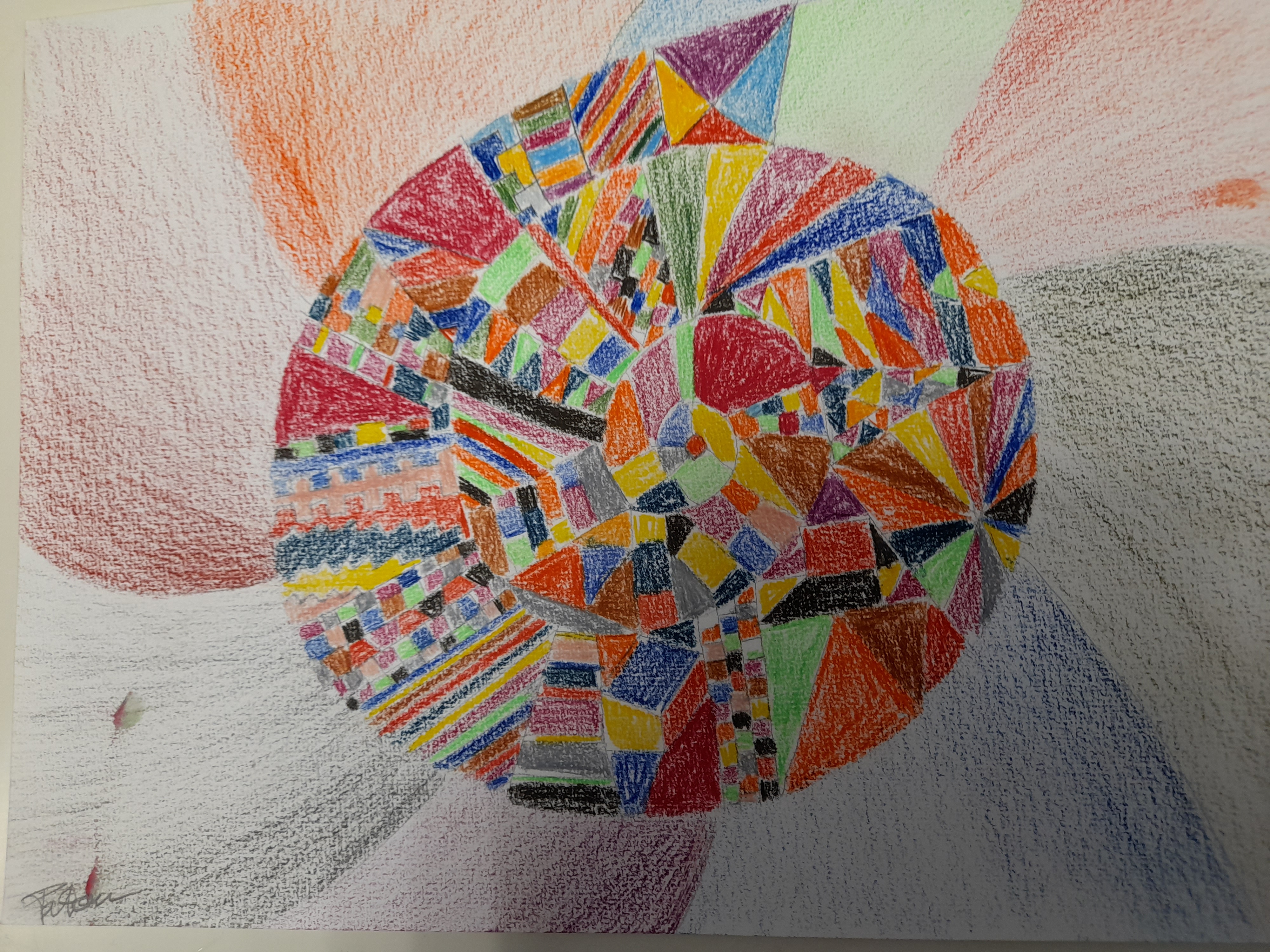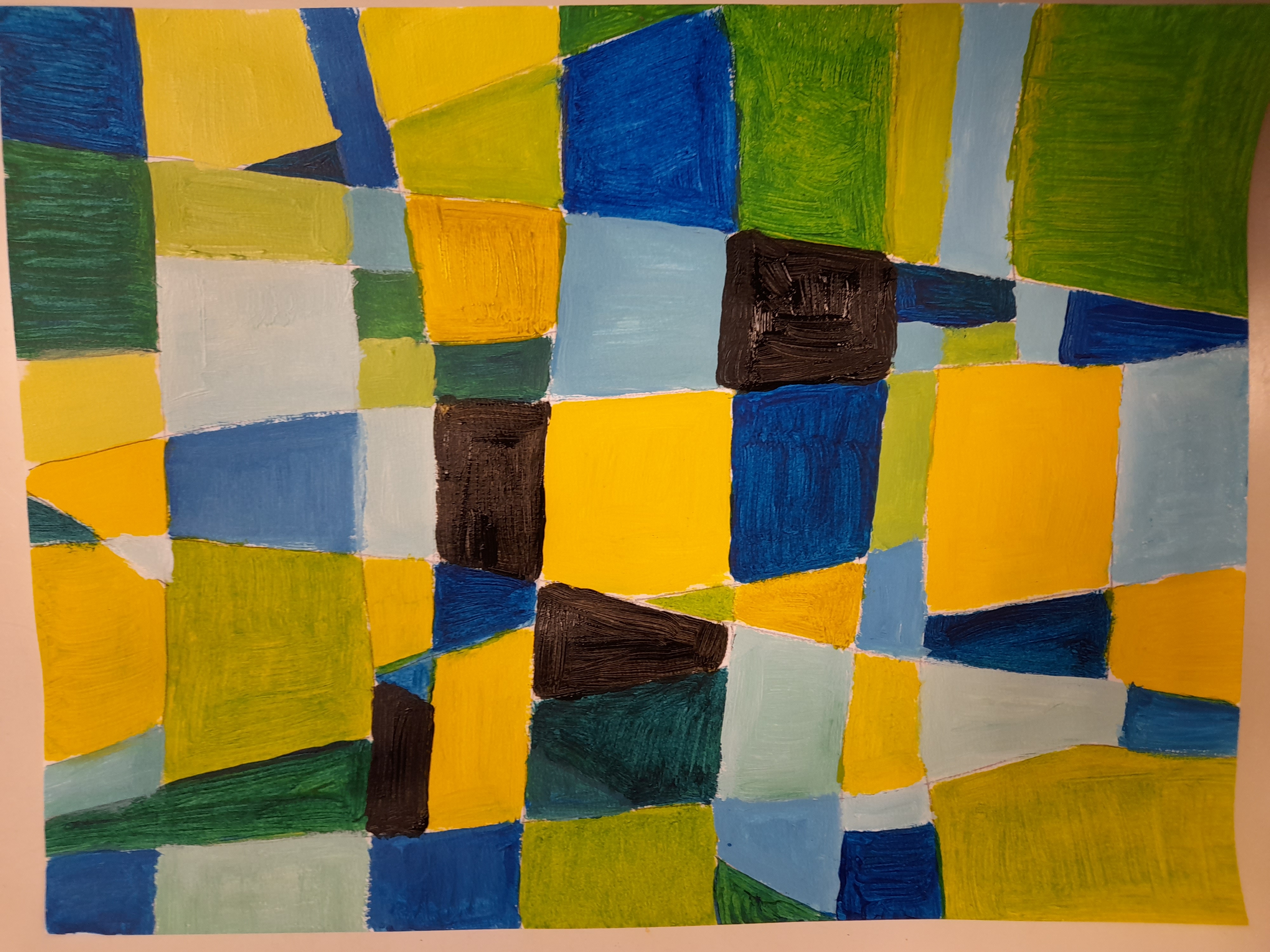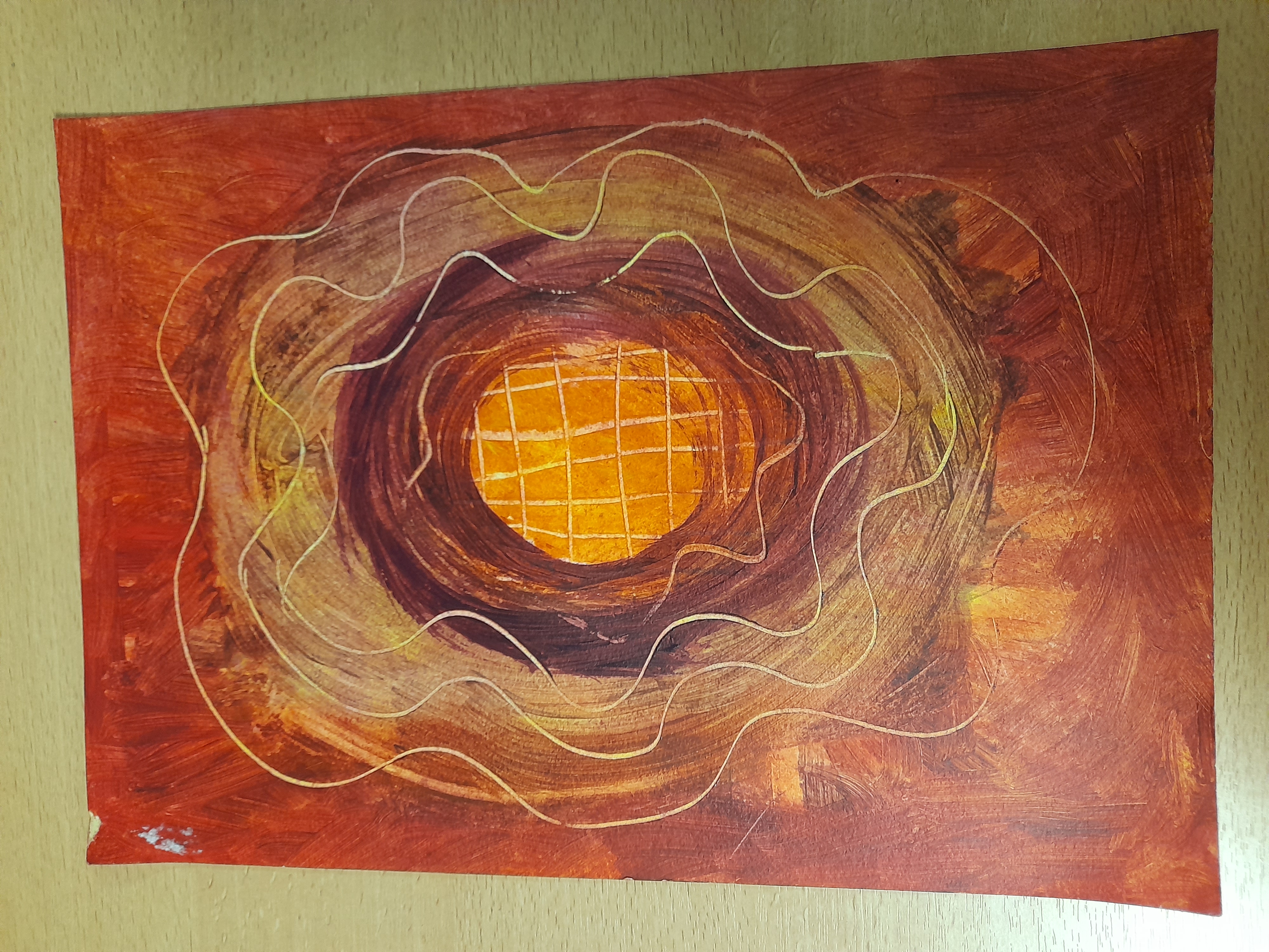 D’après les « Carrés magiques » de Paul Klee. Carrés magiques, obscurité, jour… On a joué à la fois sur l’obscur et la lumière au travers de formes géométriques, entre abstrait et figuratif. On a réalisé des carrés magiques avec des traits tracés à main levée. Et joué avec des couleurs pour définir les zones d’obscurité : couleurs froides / zones de lumière : tons chauds.