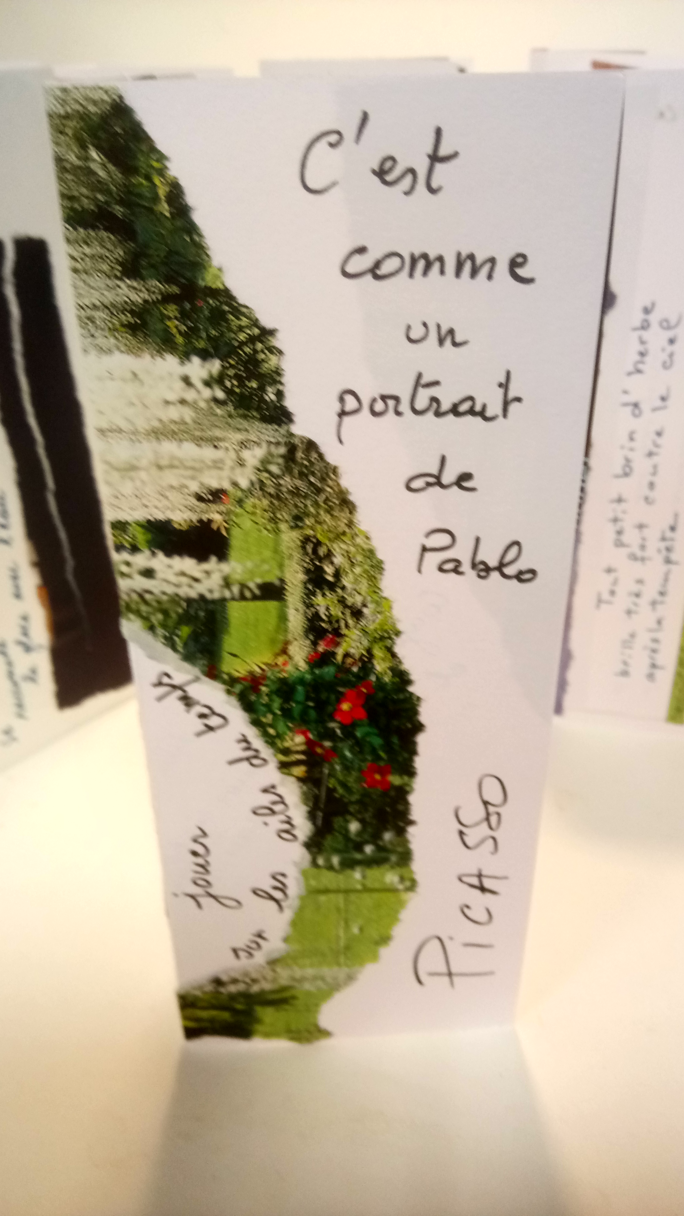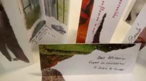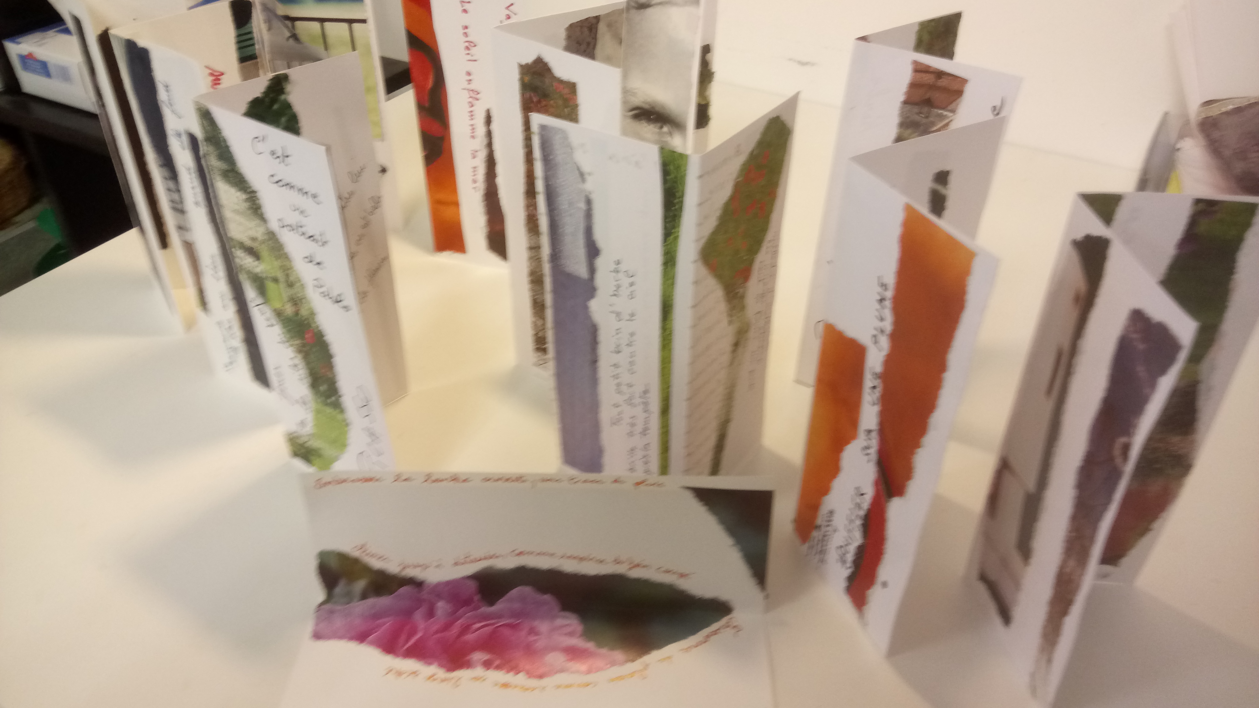 Atelier du 28.04.2018 : « Livres pauvres « . Sur un support papier une personne écrit un texte qui sera prétexte à une autre de créer une illustration ou inversement. Le « livre pauvre » est ensuite soit simplement plié en deux, soit plié en accordéon et exposé à la verticale afin de pouvoir en faire le tour et le voir dans son ensemble.