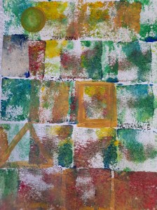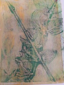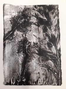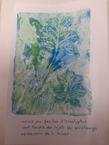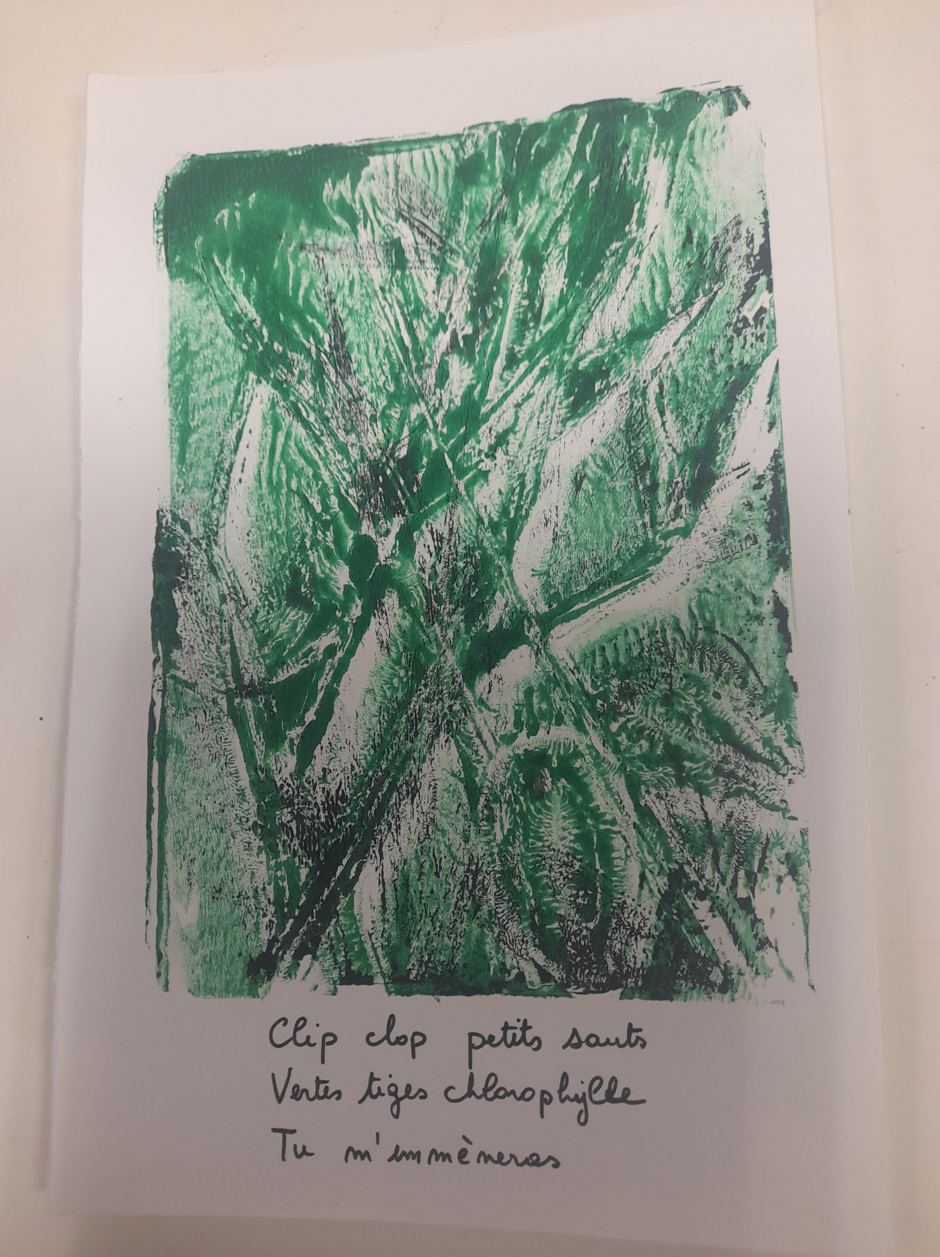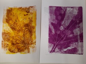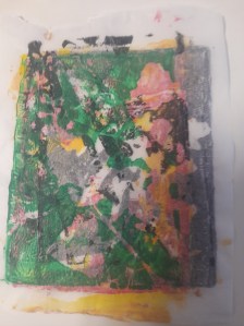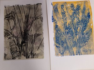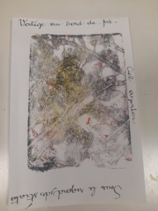 Atelier du 17 mai 2025 : réalisation de monotypes, deuxième partie. Thème : « jardins imaginaires ». Les textes sont écrits d’après les oeuvres.