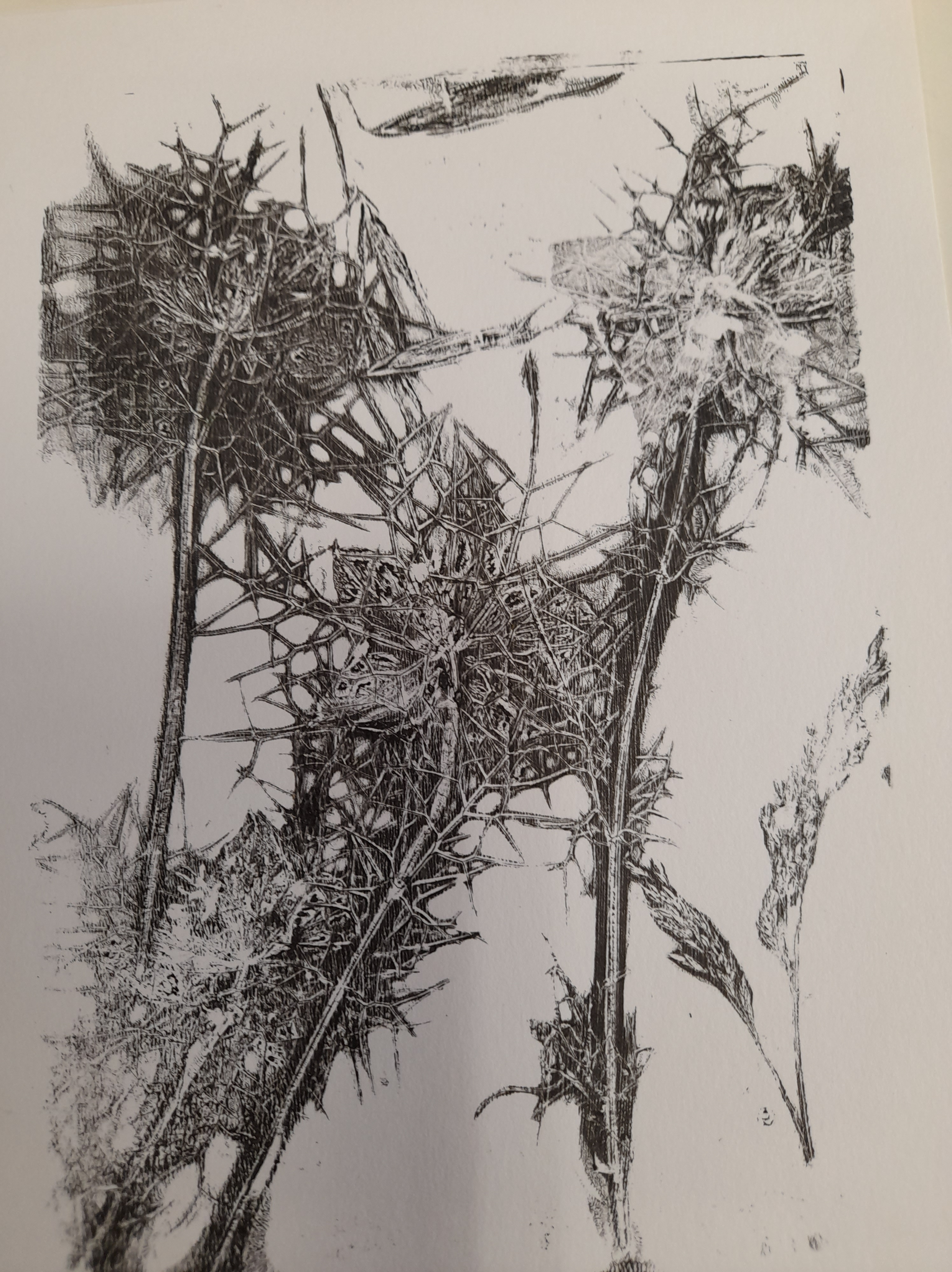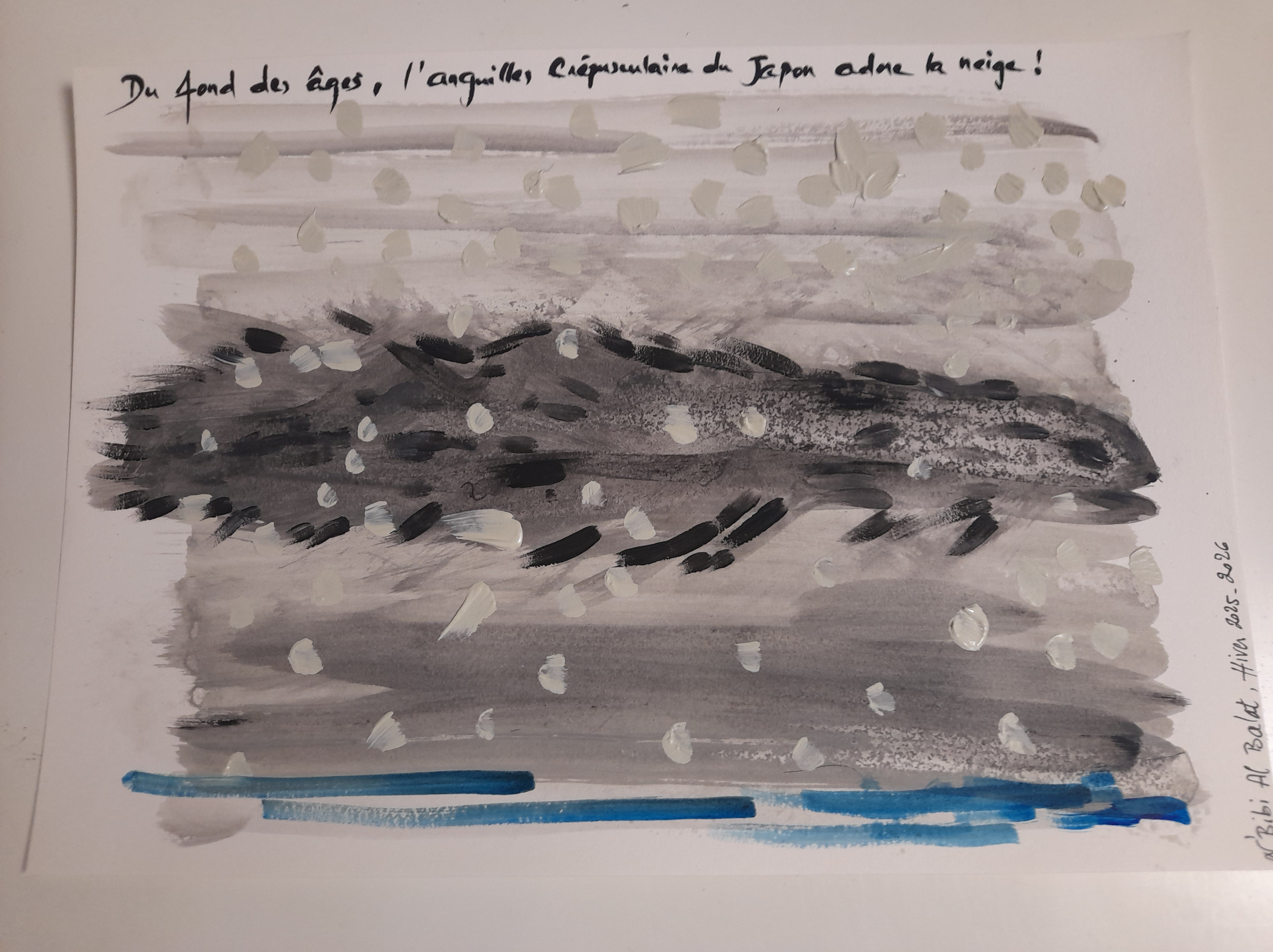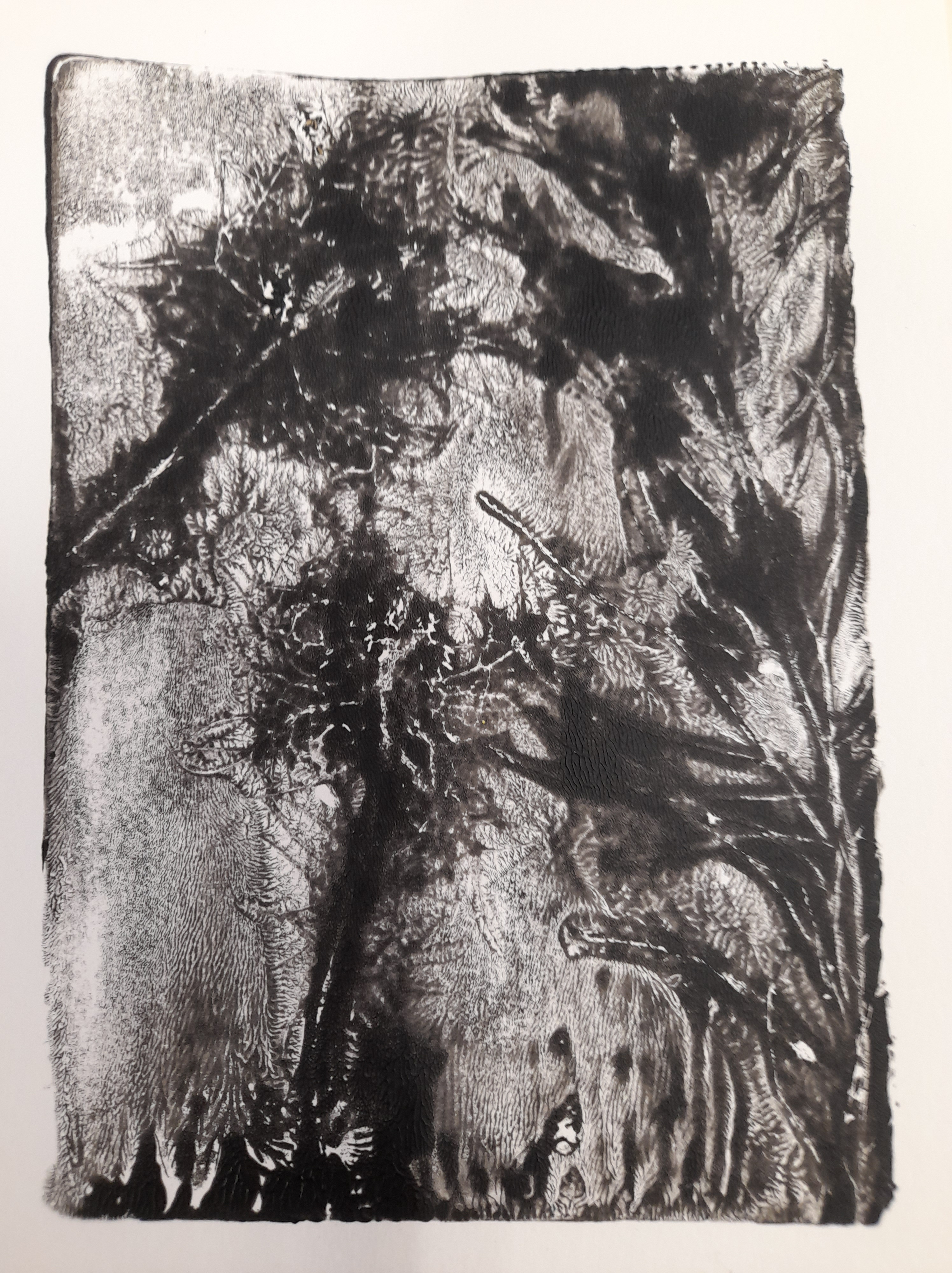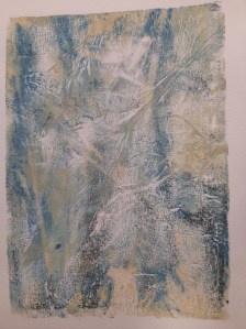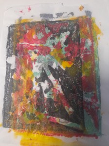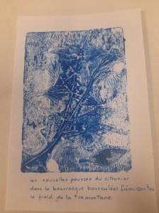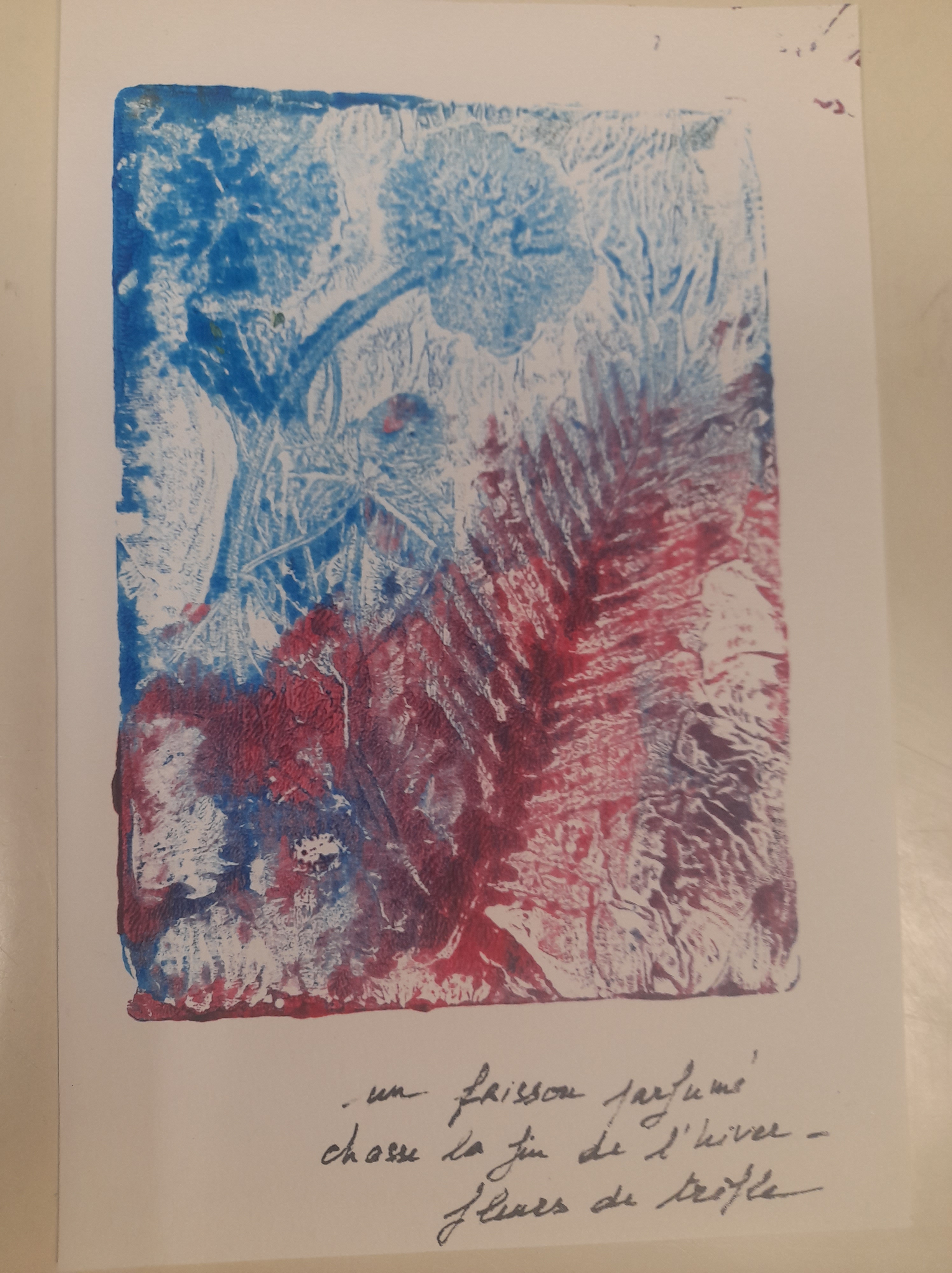 Atelier du 22 février 2025 : réalisation de monotypes. Textes support : de multiples haïkus… Participant(e)s : Annie, Carine, Laurence, Béatrice, Fred, Brigitte, Dolorès, Barbara…