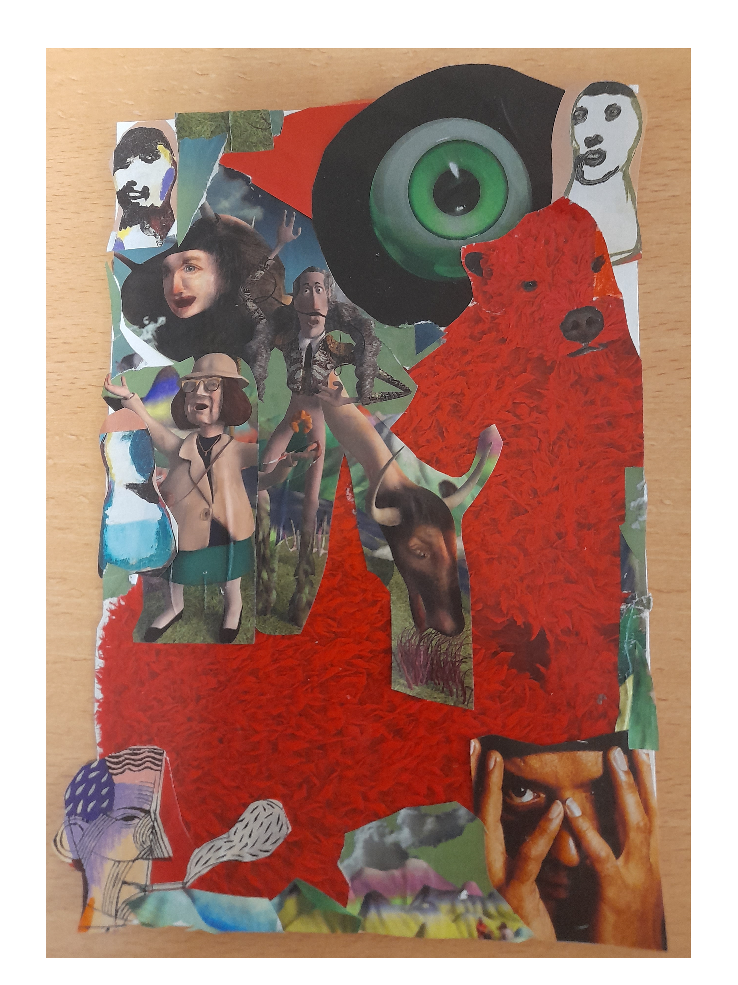 Atelier du 18 Octobre 2025 : réalisation de collages d’après « Les opposums célèbres » de Hervé Le Tellier et Xavier Gorce. Il s’agissait d’inventer des personnages mi-animal mi-personne célèbre à l’aide de mots valises. Ainsi sont nés le Rhinocérostantatoire de Annie, La Nosferatulipe et l’Escabeaudelaire de Philippe, ou encore Le Serpentalon de Béatrice, L’Iguaneinschtein et le Charmax de Carine, la Fourmilènefarmer de Emeline et aussi le Bondafreud, la Serpentipoule ou Tartatête par moi-même. Des textes d’après les oeuvres ont été écrits ensuite.