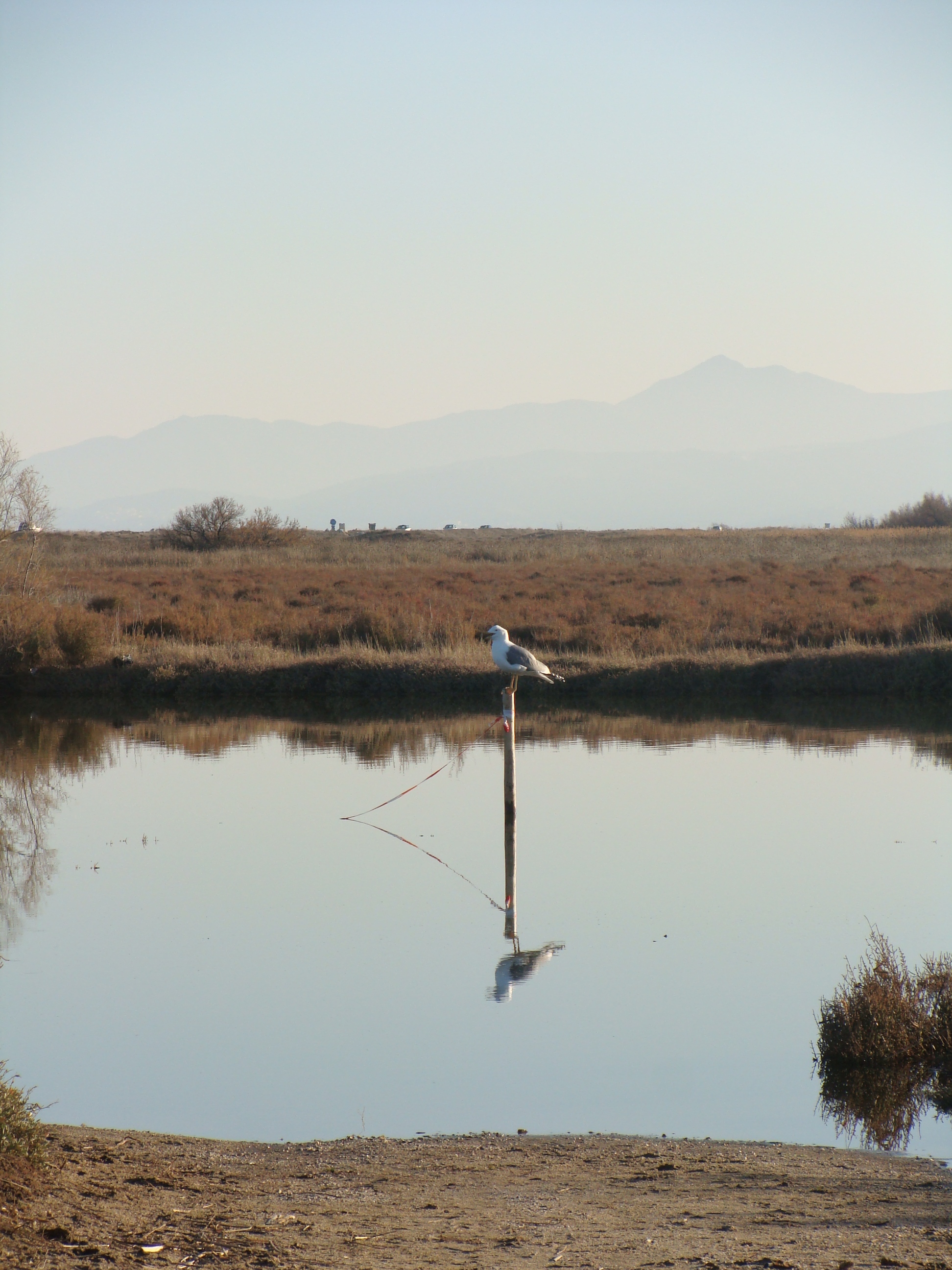 on est parti ni trop tôt ni trop tard cependant ne connaissant pas la route avec quelque appréhension ayant imprimé un itinéraire découverte éloigné des autoroutes avec un désir d’eau et d’étangs un cadre sublime le dimanche matin la ville est déserte sur la départementale 109 une caravane un camion et la voiture que je ne connais pas très bien a-t-elle assez de reprise pour doubler on est prudent peu téméraire et puis on a envie de profiter du paysage on a doublé la caravane le camion on a roulé laissé derrière nous le château de Salses contourné Sigean enfin on s’est trompé d’itinéraire on a pris la route de Peyriac-de-Mer on devait avoir envie de visiter Peyriac-de-Mer même furtivement puis de rejoindre Bages d’Aude par la petite route qui relie les deux villes colonne au milieu des étangs langue de bitume entourée d’eau qu’on n’a plus le temps de contempler mais pour laquelle on ralentit en se disant je reviendrai je reviendrai