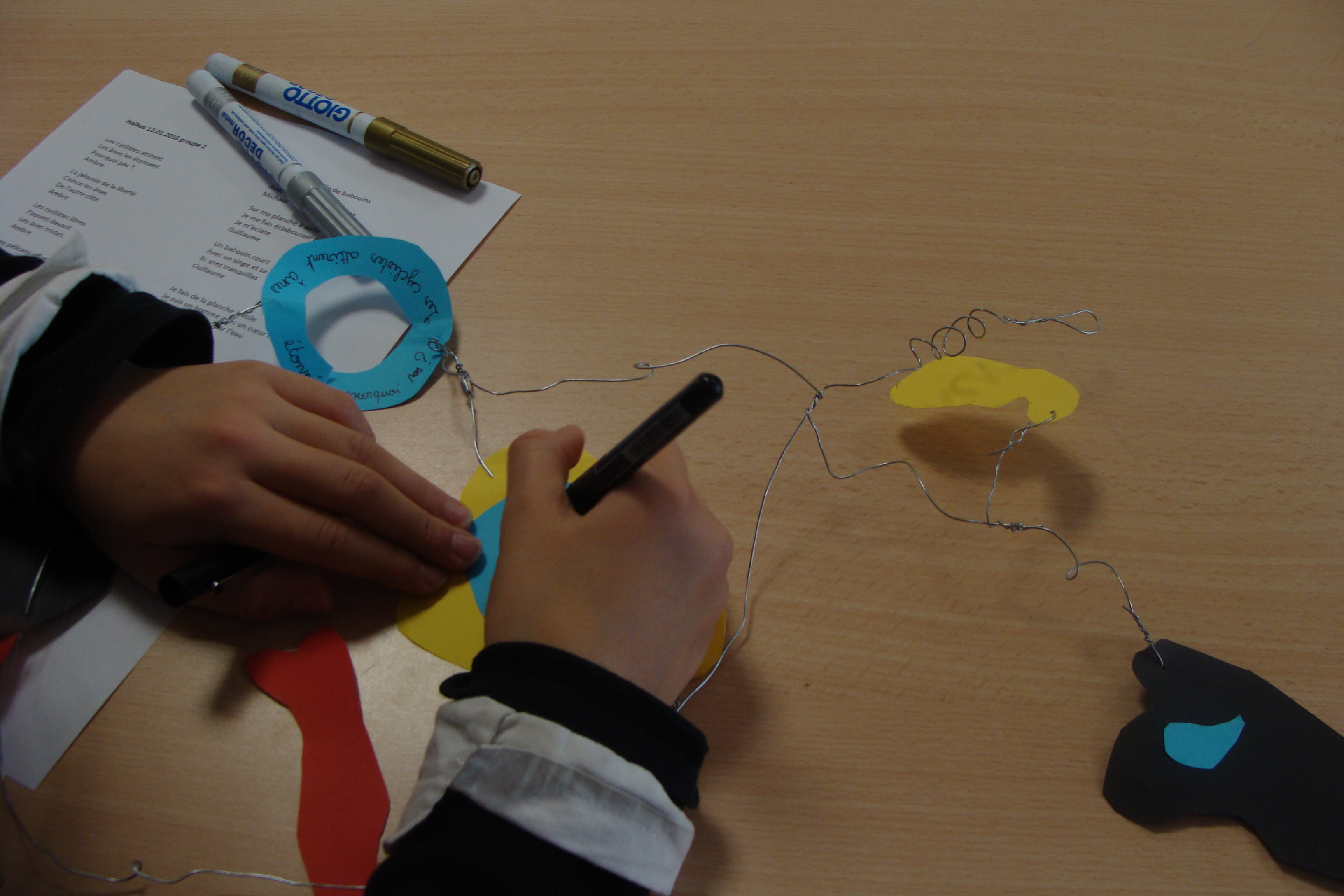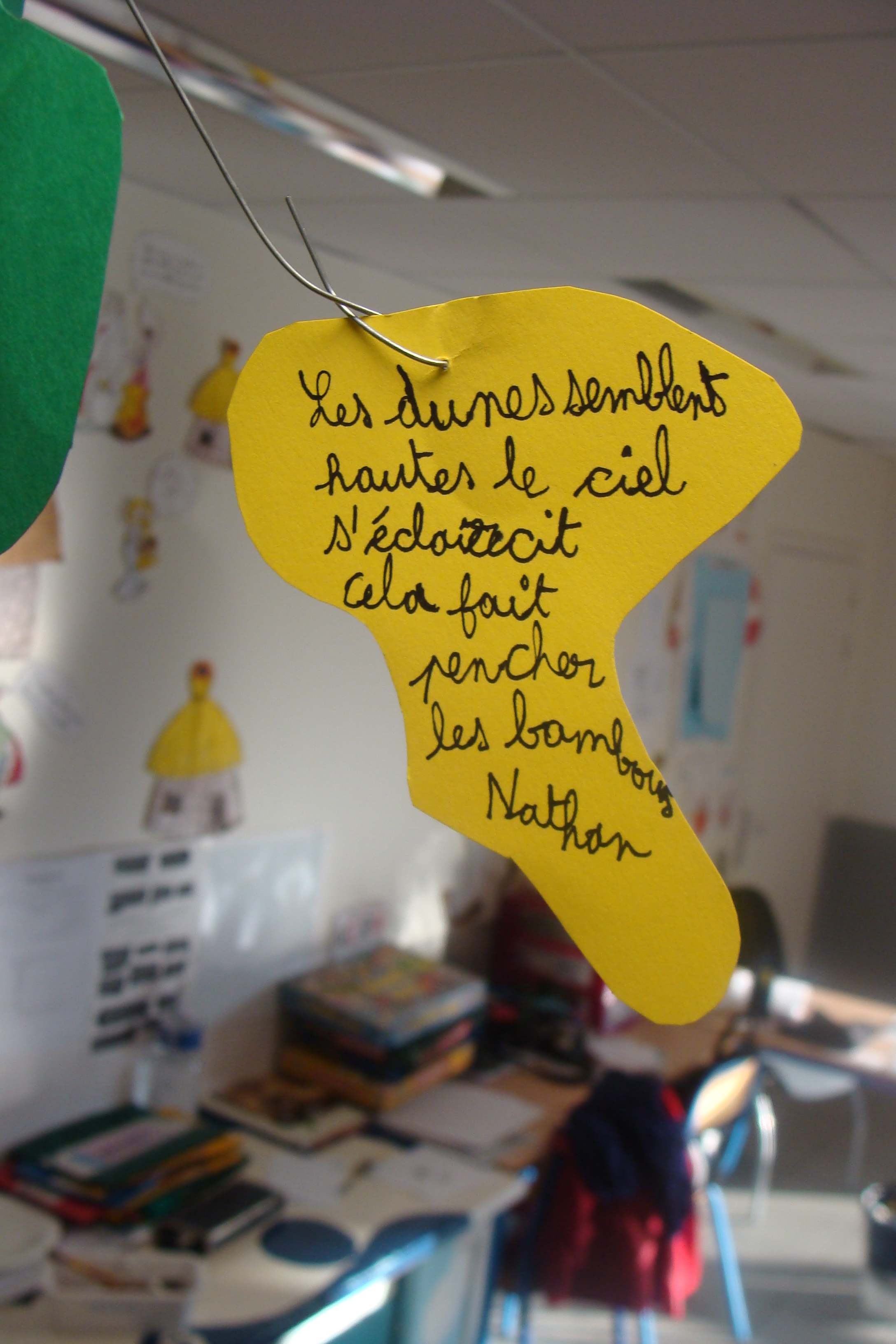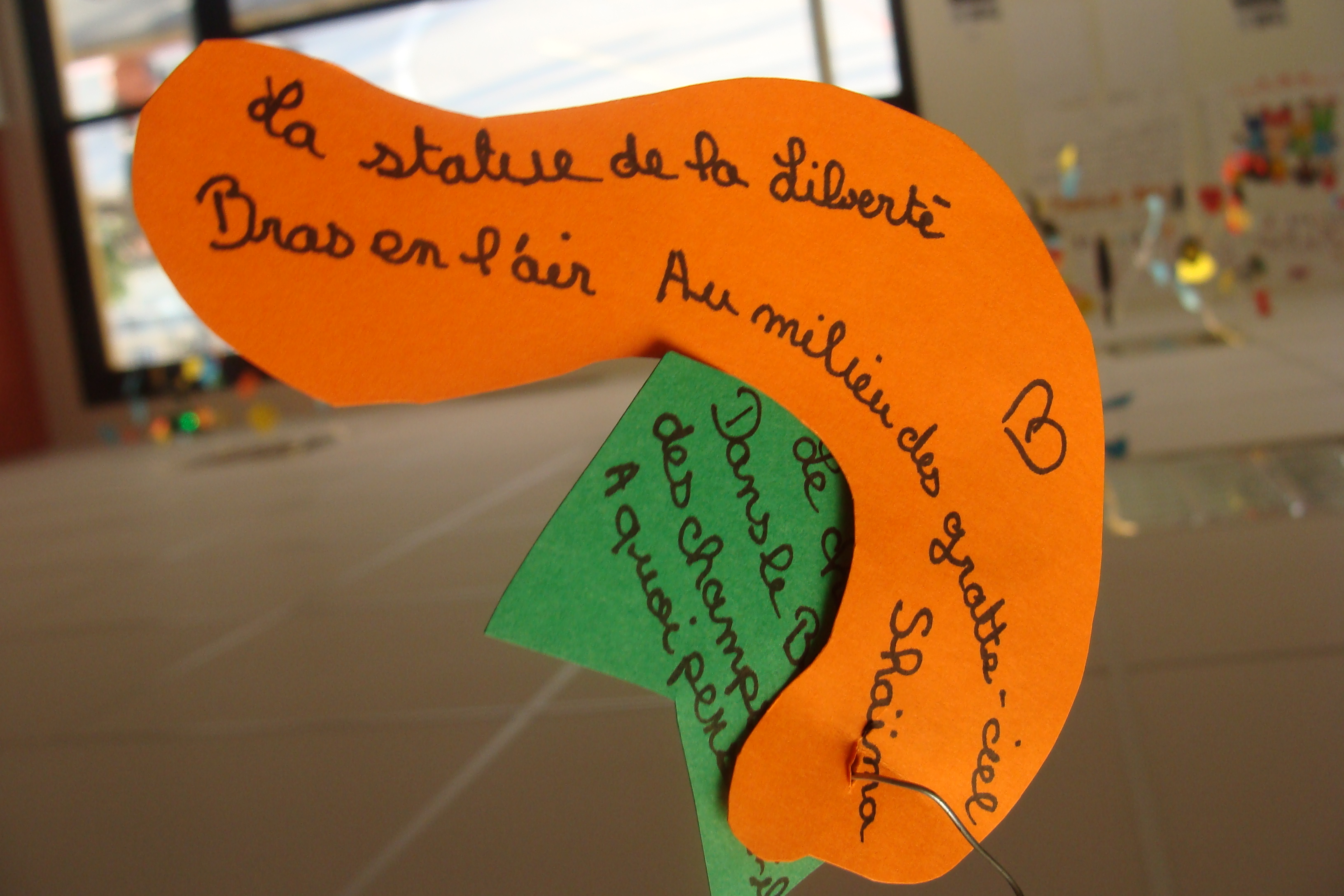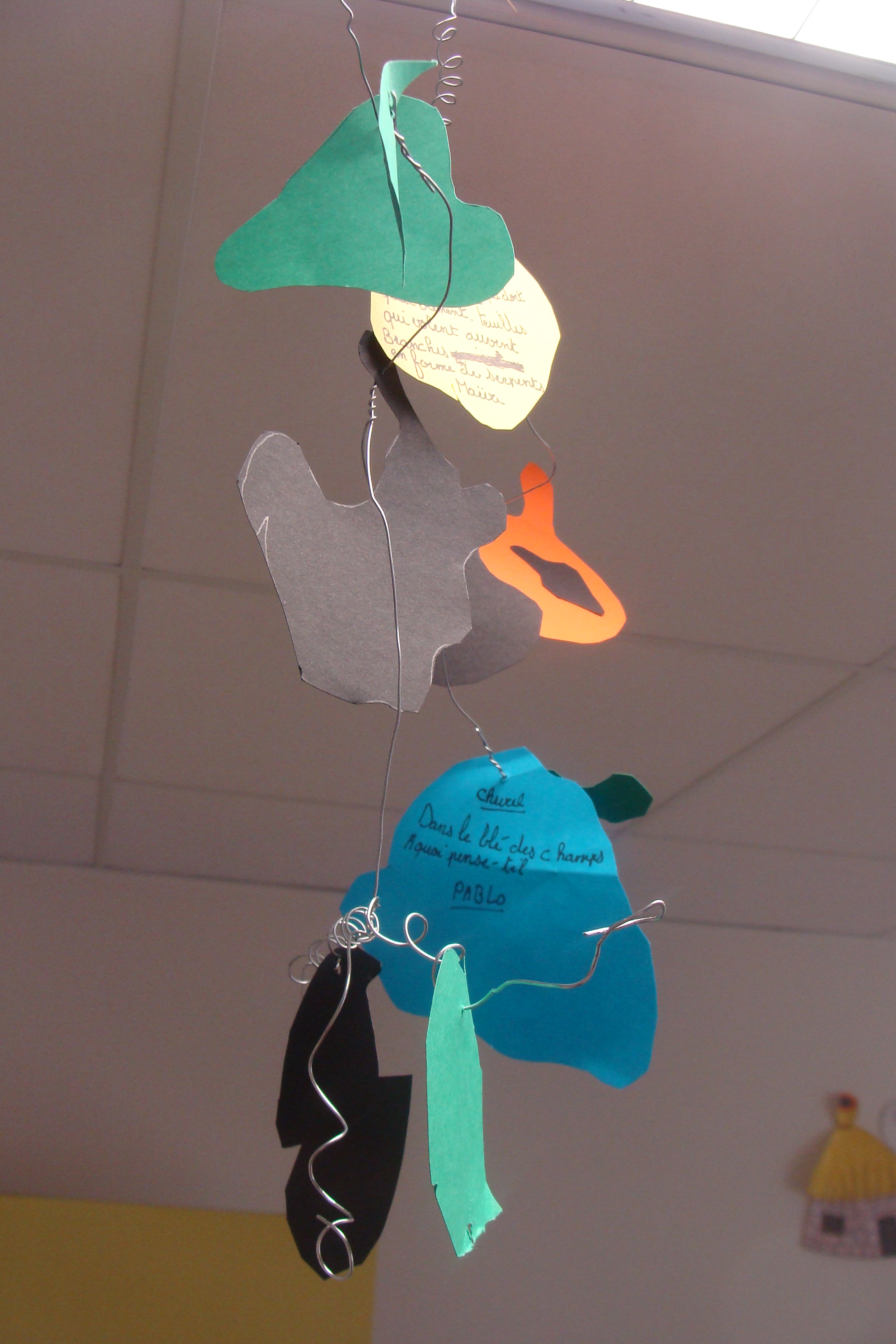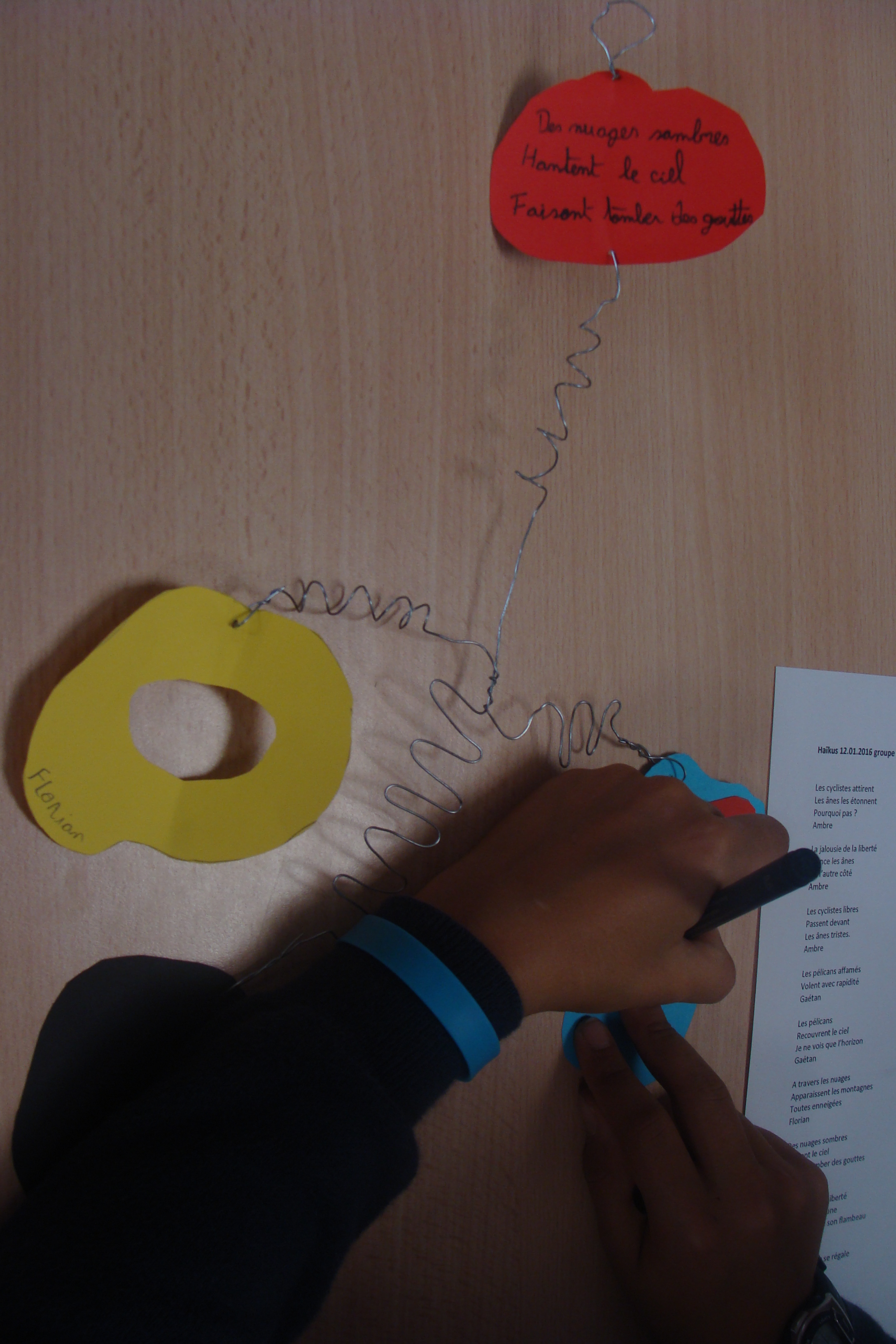 Suite de mes interventions au sein de l’école élémentaire Joseph Néo à Elne, dans le cadre des NAP (Nouvelles Activités Périscolaires) où j’anime des ateliers d’écriture poétique et d’arts plastiques trois jours par semaine. En période 3 de l’année scolaire, quelques essais d’écriture de haïkus avec des élèves de CM, haïkus présentés sur des mobiles appelés « Poèmes-mobiles ». L’activité a bien plu aux enfants ravis de réaliser leur poème-mobile en fils de fer et papiers colorés.