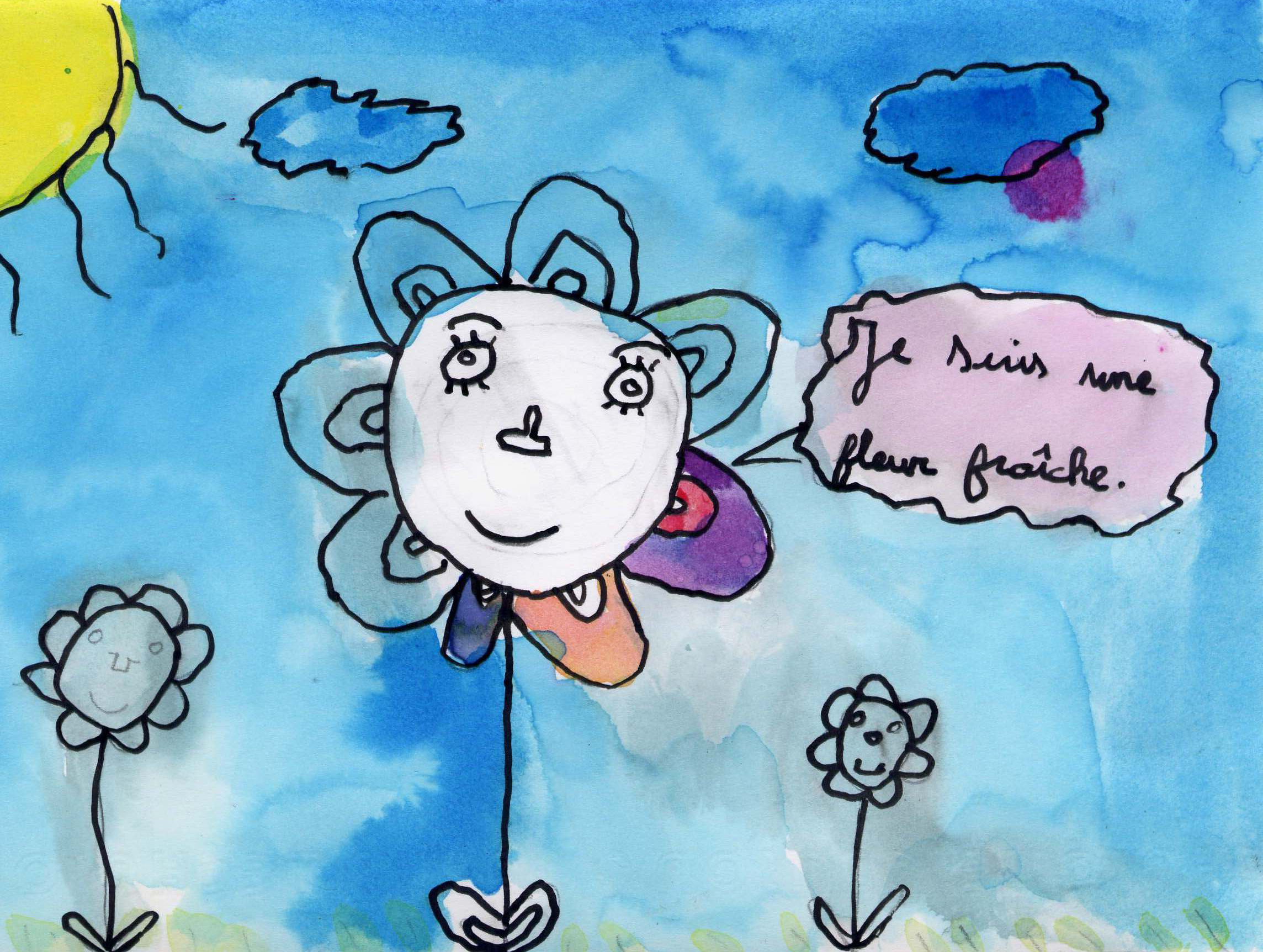 Dans ma ville il y a un immeuble construit à côté d’un fleuve des moucherons et des bourgeons ainsi qu’un passage piétons une maison avec des cochons des magasins pleins de lapins. il y a mon cœur qui bat tout bas Dans ma rue il y a un trottoir avec un entonnoir ainsi qu’un boulevard une porte … enfin, peu importe une abeille dans une bouteille Dans ma maison il y a des moutons pleins de moucherons des cochons ronchons il y a des fleurs qui montrent l’heure il y a aussi mon cœur qui bat tout bas.
